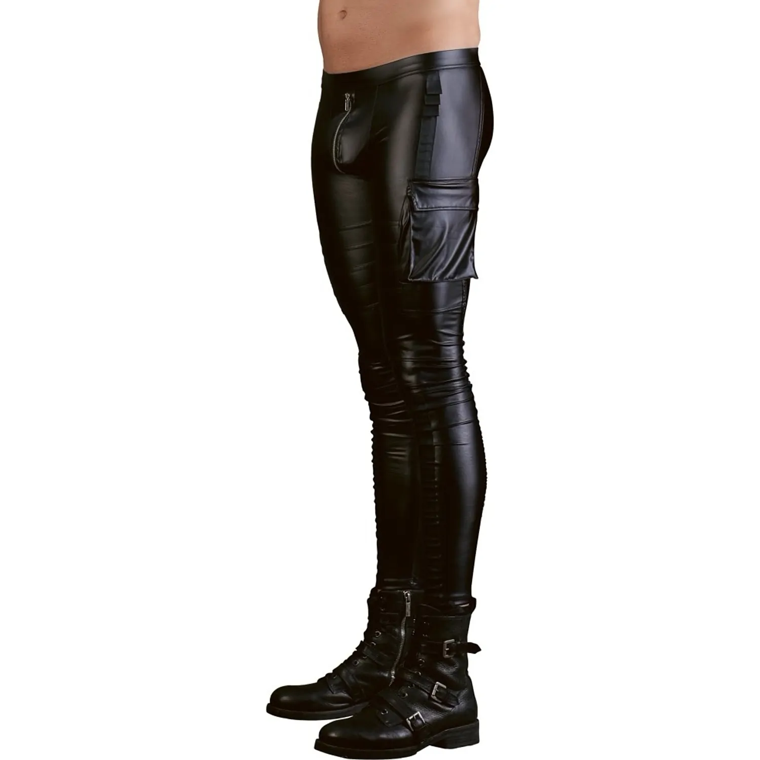 Aspect cool de motociclist! Pantaloni slim fit cu aspect mat, buzunar lateral mare, bretele cusute, nituri și inele.