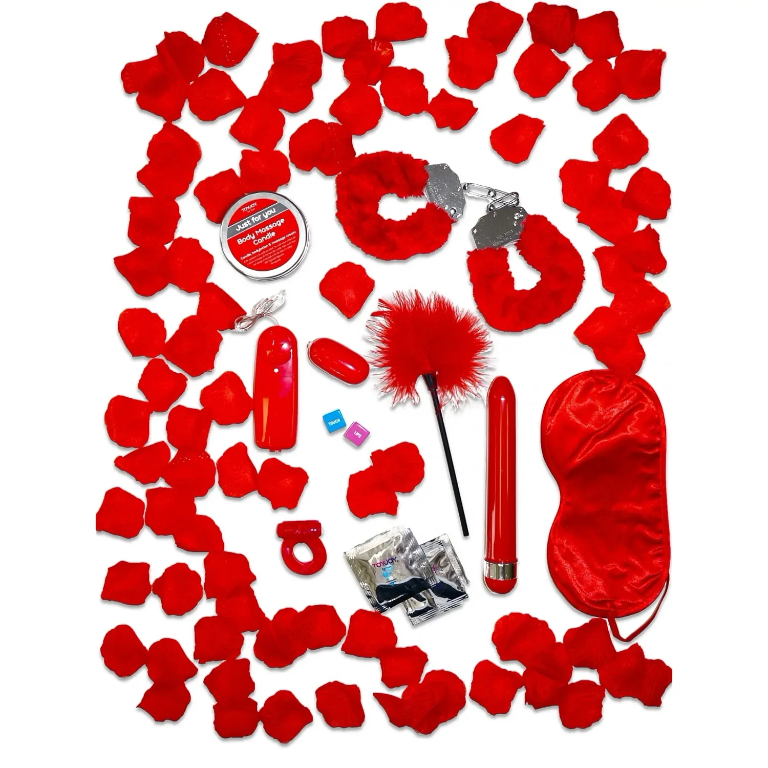 Setul Red Romance Toy Joy conține: -cătușe cu plus roșu -vibrator glonț -ou vibrator cu telecomandă -inel cu vibrații -lumânare pentru masaj -petale de trandafir -mască pentru ochi -zaruri pentru joc -lubrifiant