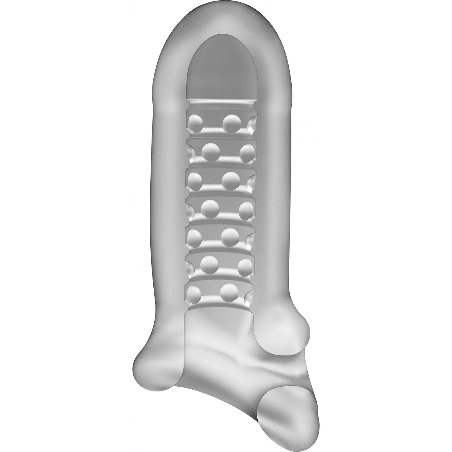 Uneori vrei doar puțin mai mult. Moale și elastic pentru a vă îmbrățișa idilic arborele, acest manșon de măsură majoră se întinde pe șase centimetri de la bază până la un cap ferm, într-un material transparent, mat, care arată și se simte incredibil. Este un accesoriu ce nu trebuie să lipsească. Are un orificiu la bază, pe unde se introduc testiculele care susține la fixare. Interiorul este căptușit cu noduli pentru o euforie maximă.