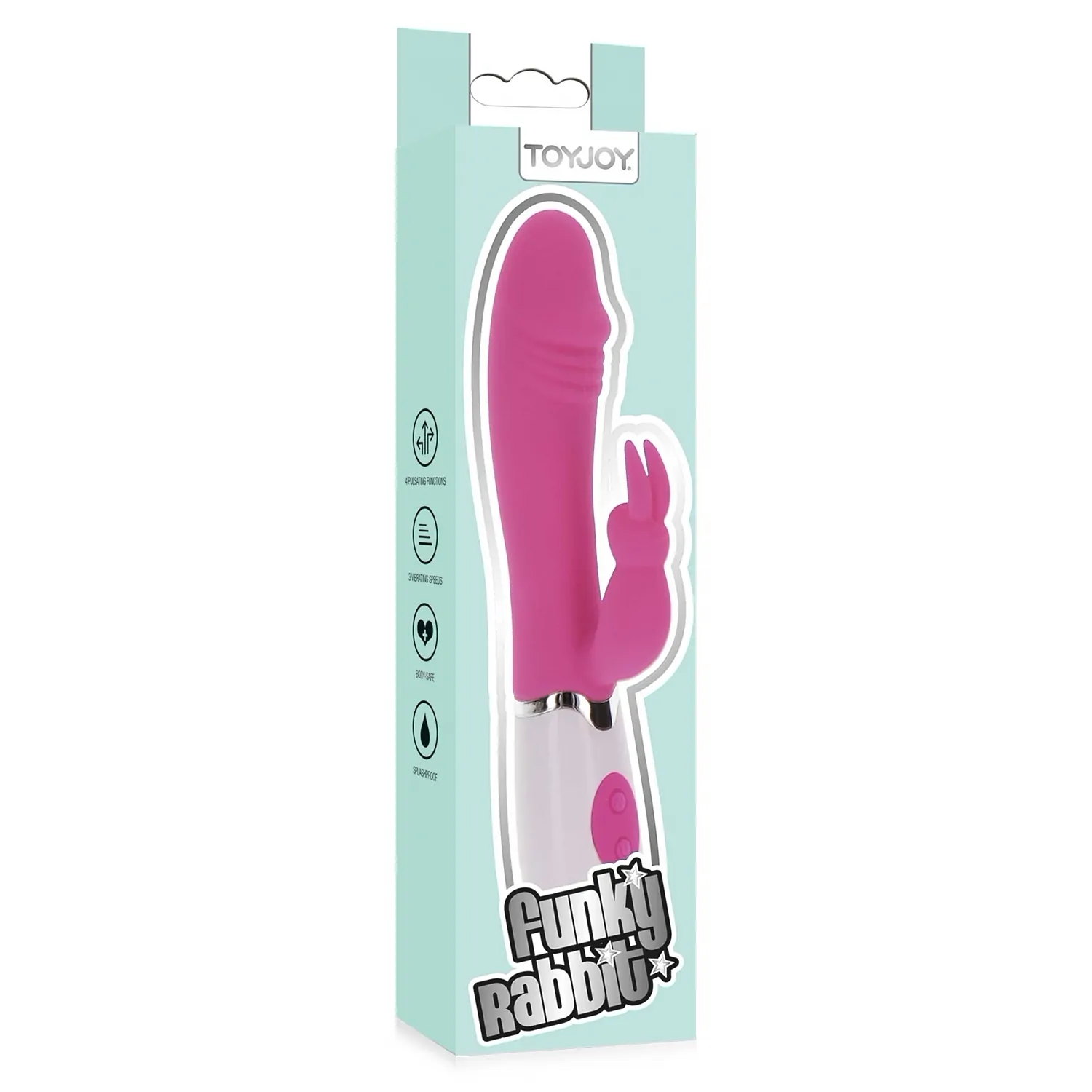 Funky Bunny este un vibrator distractiv, puternic, într-o colorație vibrantă. Designul include un stimulator de clitoris în stil iepuraș. Vibratorul este sigur pentru corp, rezistent la stropire și este confecționat 100% din silicon pur. Bucurați-vă de 4 maniere variate de vibrație și de 3 niveluri de viteză diferite. Predați-vă distracției și deveniți Funky!
