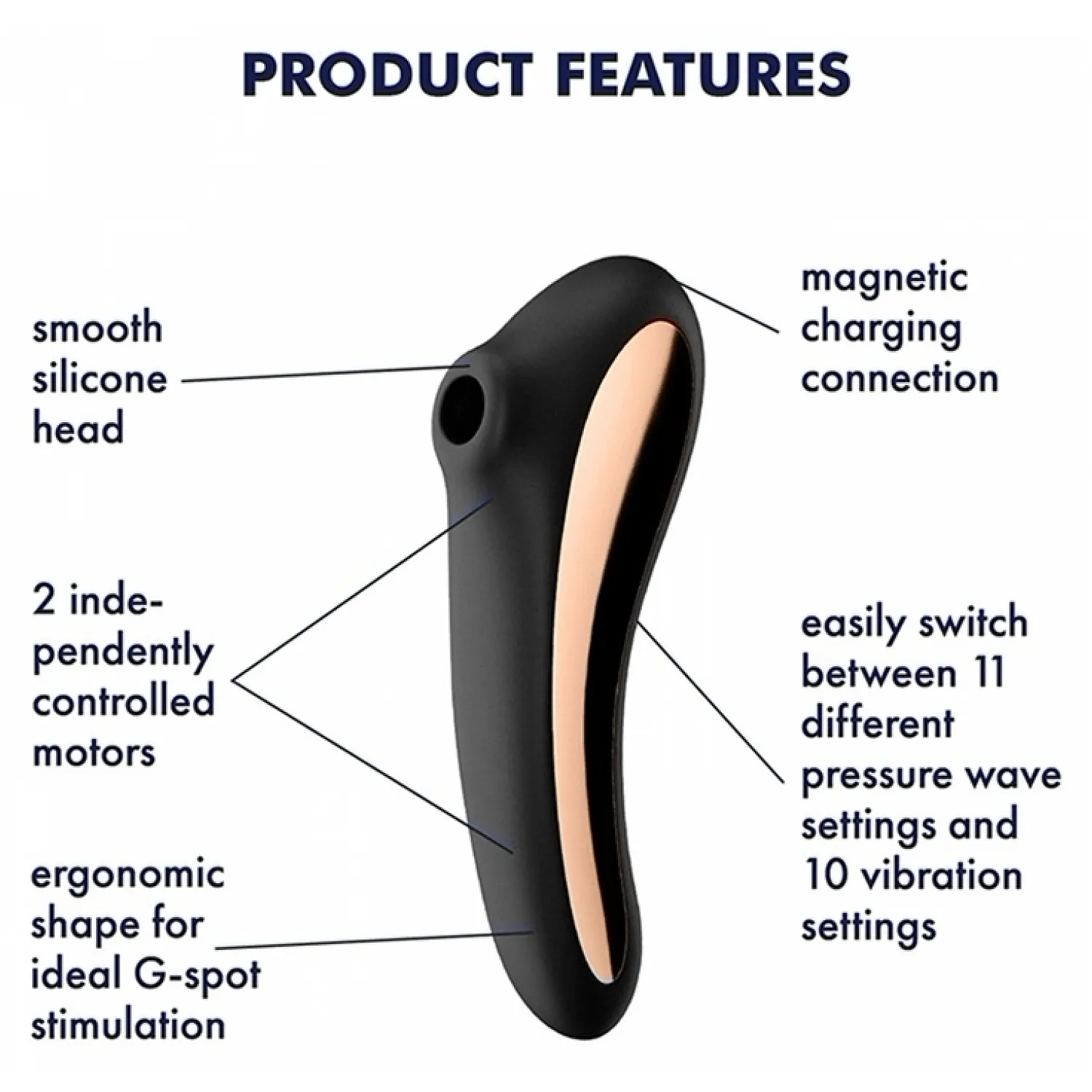 Pe lângă stimularea clitorisului cu undele sale de presiune pulsante, Dual Kiss poate fi întrebuințat și pentru un masaj stimulant al punctului G cu brațul ușor curbat. 11 intensități ale undelor de presiune și 10 setări de vibrații sunt disponibile pentru a-ți satisface toate dorințele.