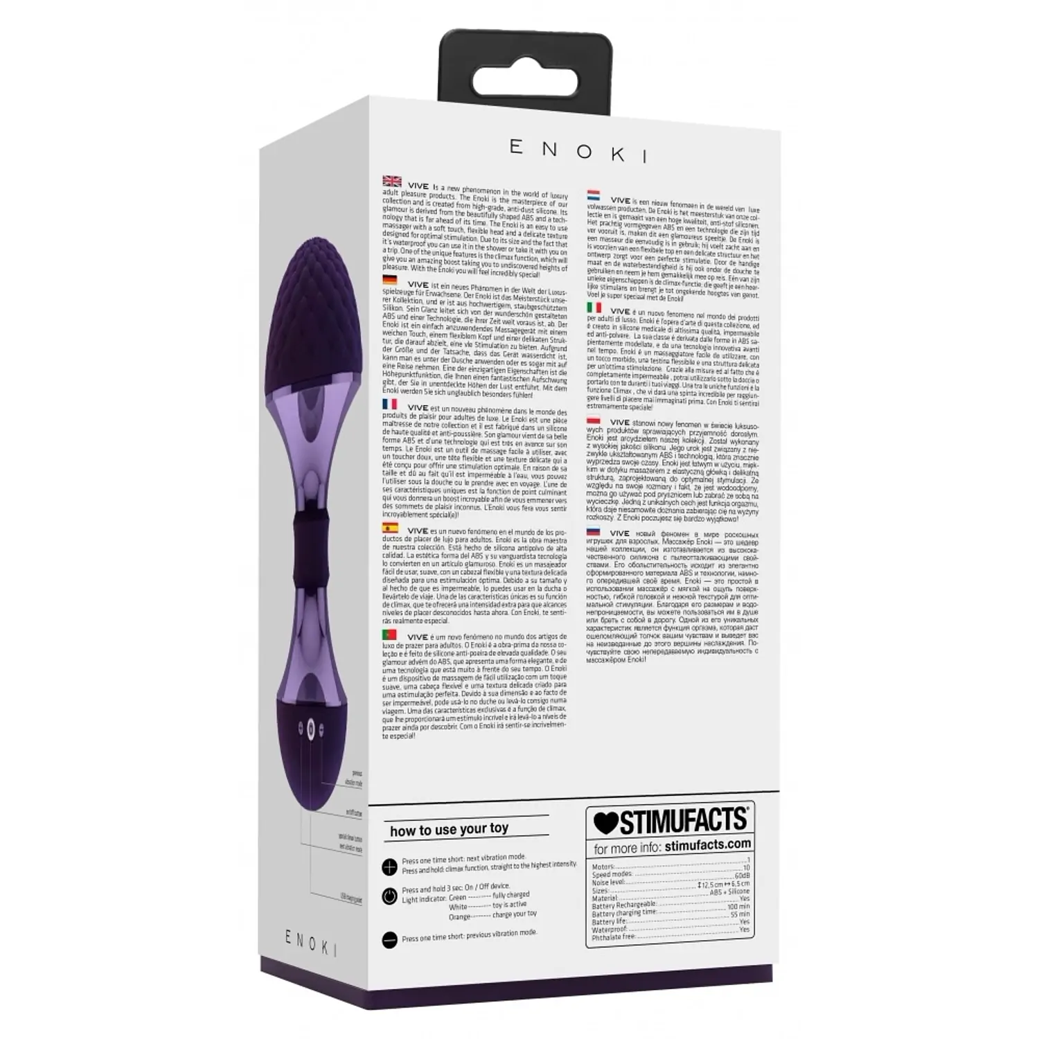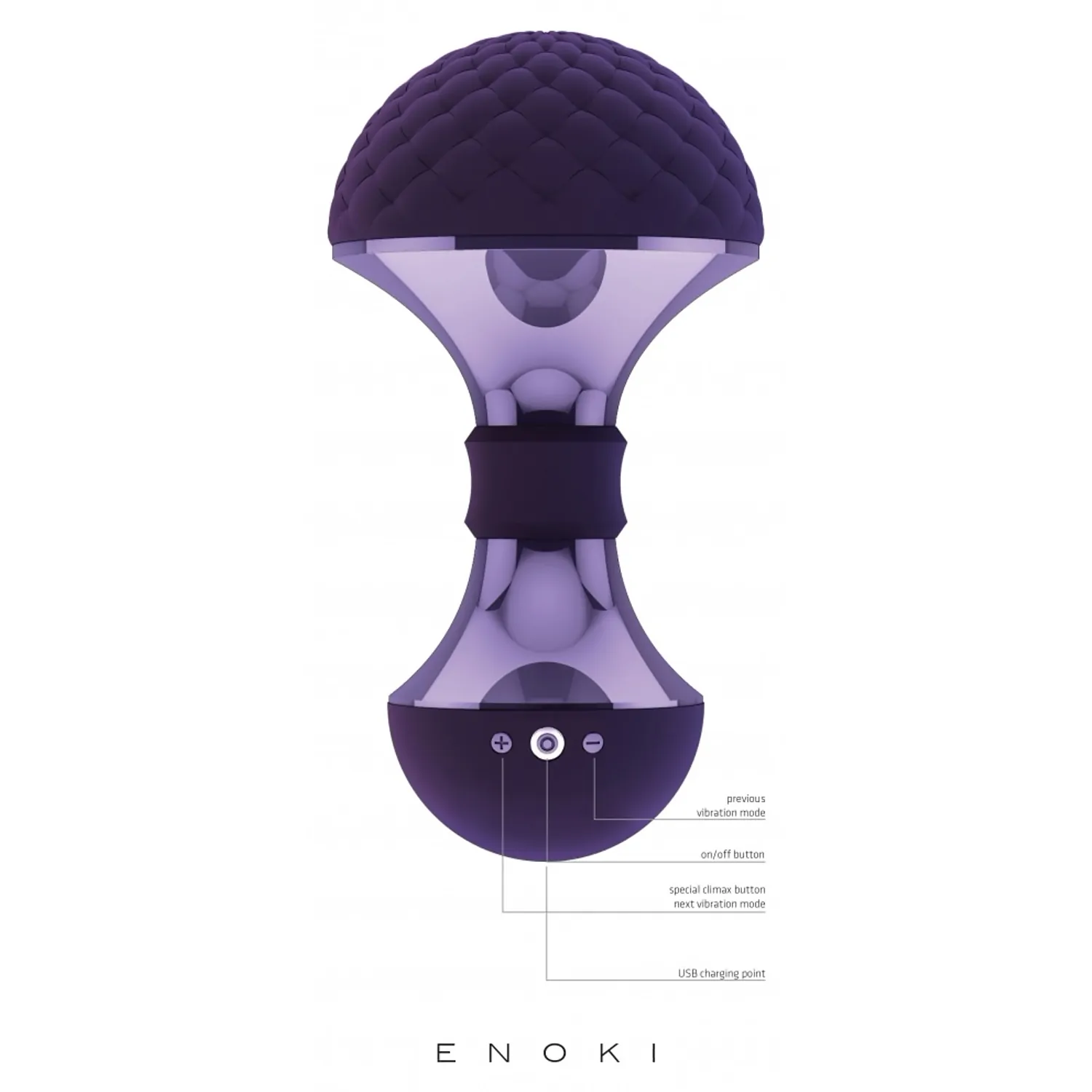 Prins confortabil în mână utilizând o bază rotunjită, vârful circular cu acoperire desăvârșită a lui Enoki înconjoară cu ușurință clitorisul, sfârcurile, penisul și multe alte posibile alte zone erogene. O textură subtilă de tip fagure și o suprafață unică de plus se îmbină cu zece moduri de vibrație constantă, pulsatorie și crescătoare, în timp ce gâtul flexibil se îndoaie pentru a se potrivi aproape oricărei poziții.