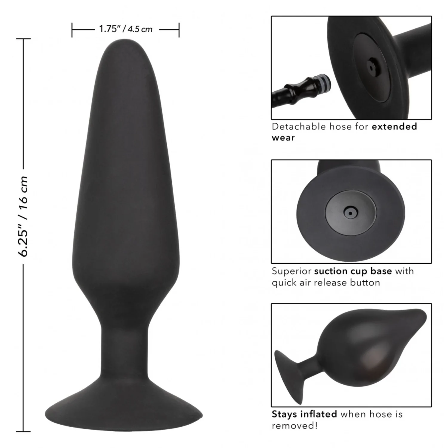 Anal plug-ul gonflabil CalExotics cu miez solid te va încânta cu un furtun detașabil, astfel că îl poți umfla ușor la măsură dorită, iar după scoaterea furtunului, jucăria va persistă umflată.