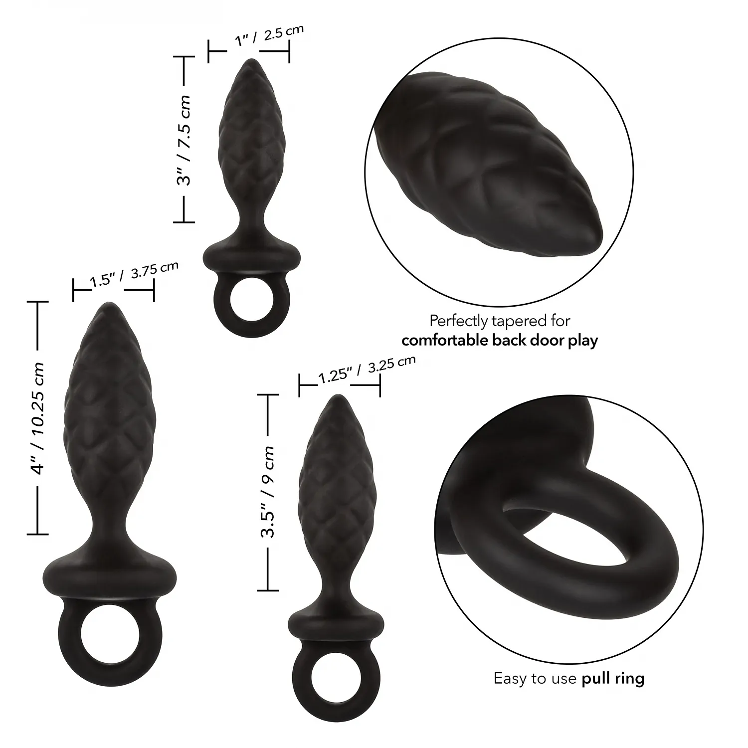 Setul de la CalExotics este alcătuit din 3 pluguri anale cu diametru de 2.5 centimetri, 3.25 și 3.75 cm. Fiecare plug este acompaniat de o bază amplă și un inel de siguranță care le fac sigure în timpul purtării și ușor de îndepărtat atunci când se termină distracția.