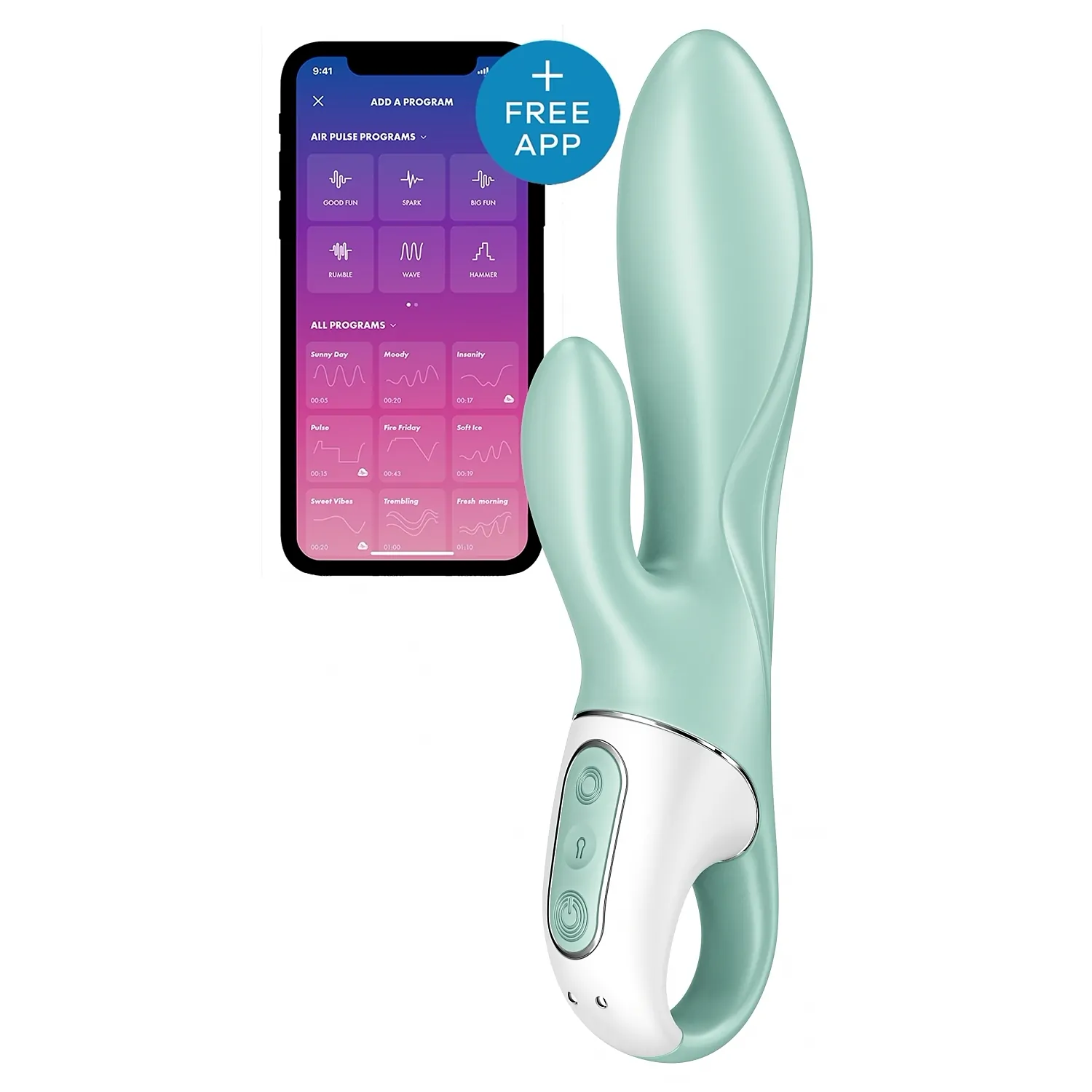 Nu numai că, din pricina celor două motoare ale sale, jucăria întărâtă excelent vaginul și clitorisul cu vibrații puternice de la arborele central și de la capătul mic. La contact moale și creat din materiale dermo-compatibile, Air Bunny este echipat și cu o bază inel și mai numeroase programe de vibrații.