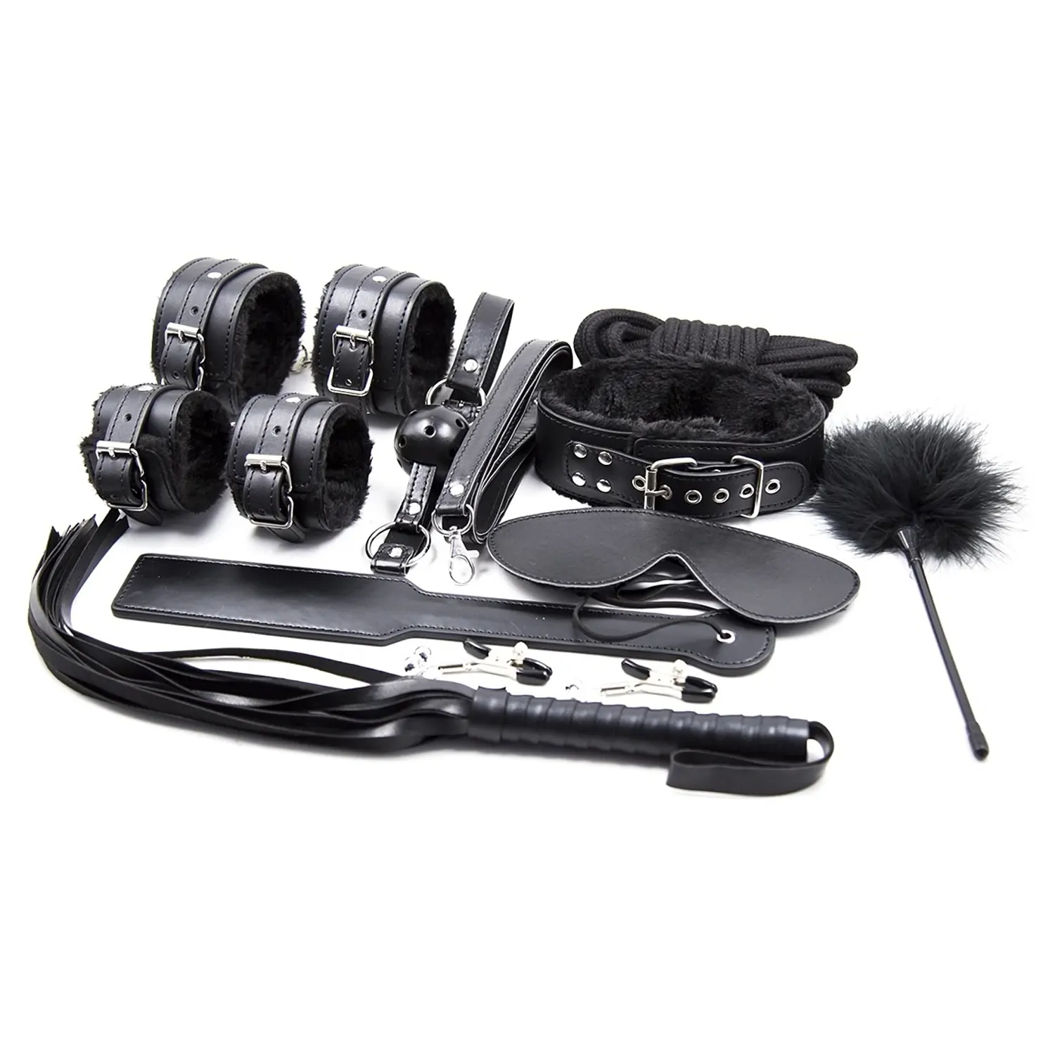 Set de bondage suprem pentru începători. Este format din 10 articole. Manșete. Manșete la glezne. Mască. Paletă. Flogger. Tickler. Guler cu lesă. Căluș cu minge. Cleme pentru mamelon. Frânghie. Cătușele sunt căptușite cu o blană moale pentru un înfățișare luxos și o purtare confortabilă.