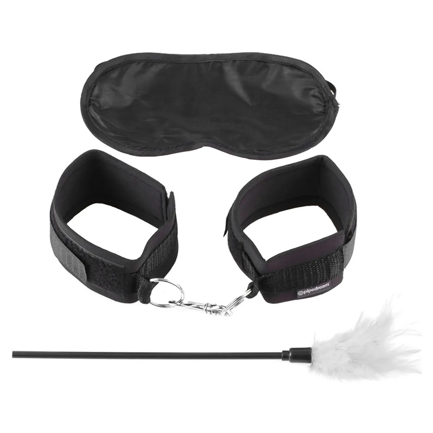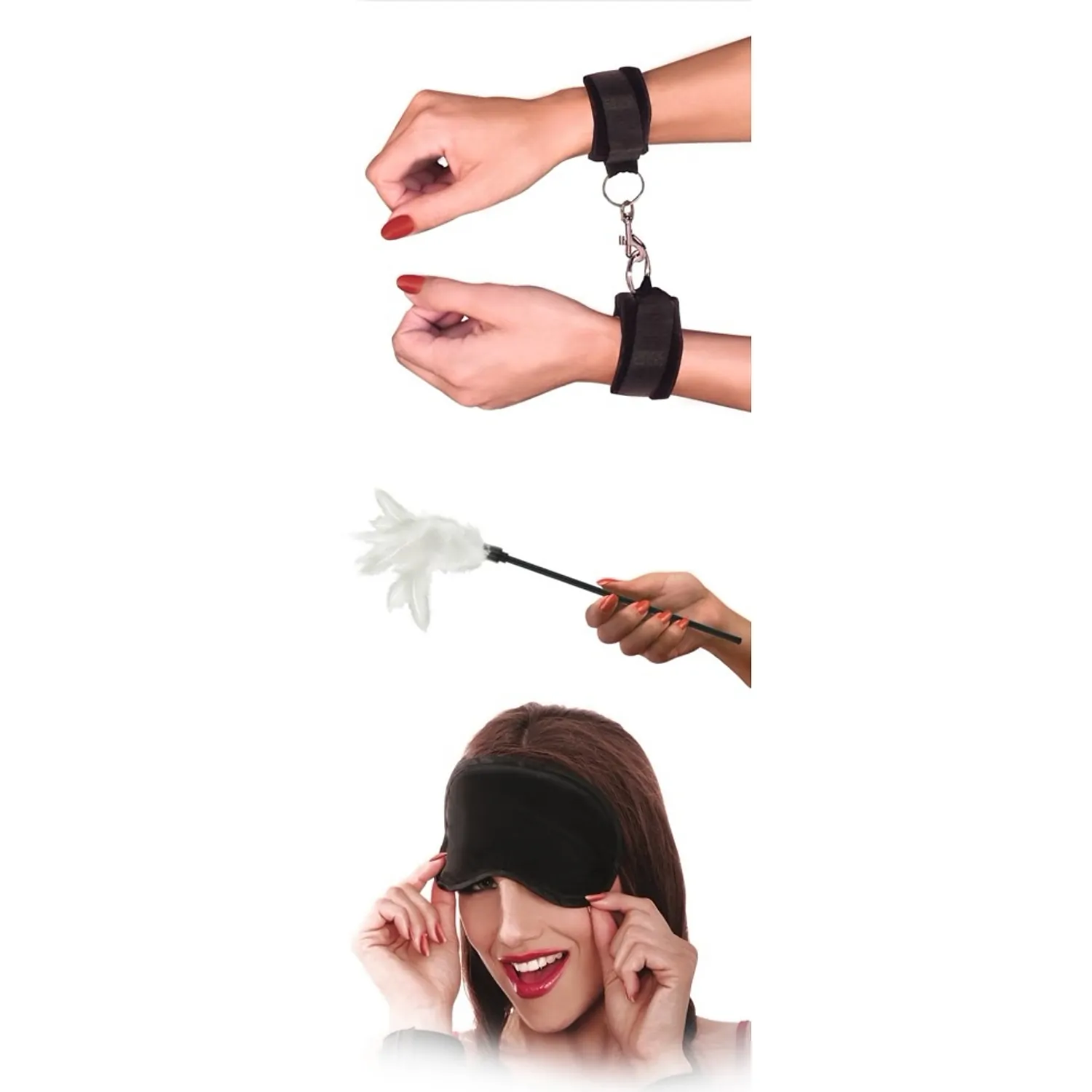 Set BDSM ce are și tickler cu pană, cătușe din material fin și mască pentru acoperirea ochilor. Veți descoperi împreună de câtă distracție puteți avea parte cu uneltele potrivite. Modificați-vă rutina și aduceți un pic de spontaneitate și un element de surpriză și anticipare în dormitor.