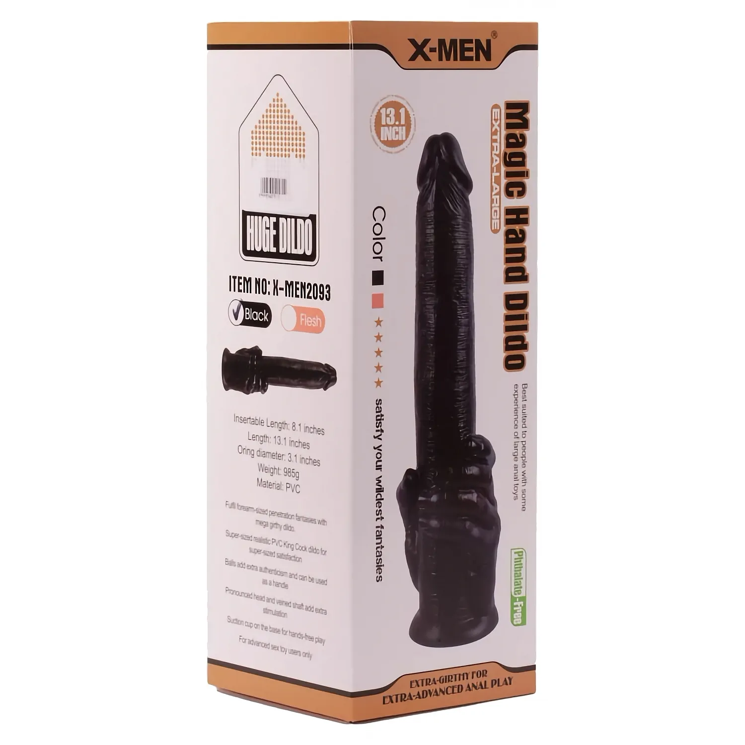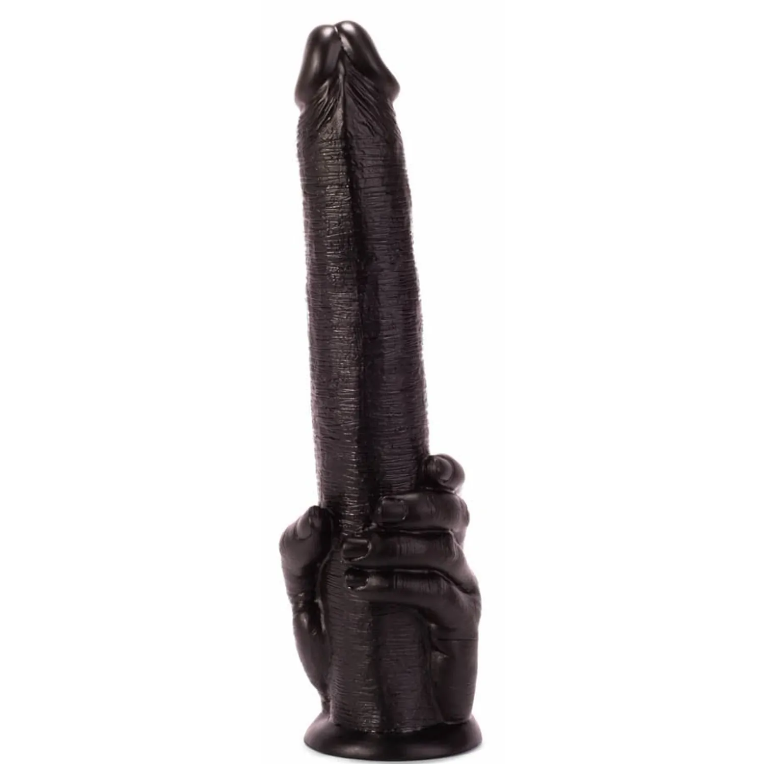 Mâna care ține un dildo gigant, concretizat dintr-un material cu o senzație asemănătoare cu pielea, similară cu substratul trupului și cu o arie cu vene.