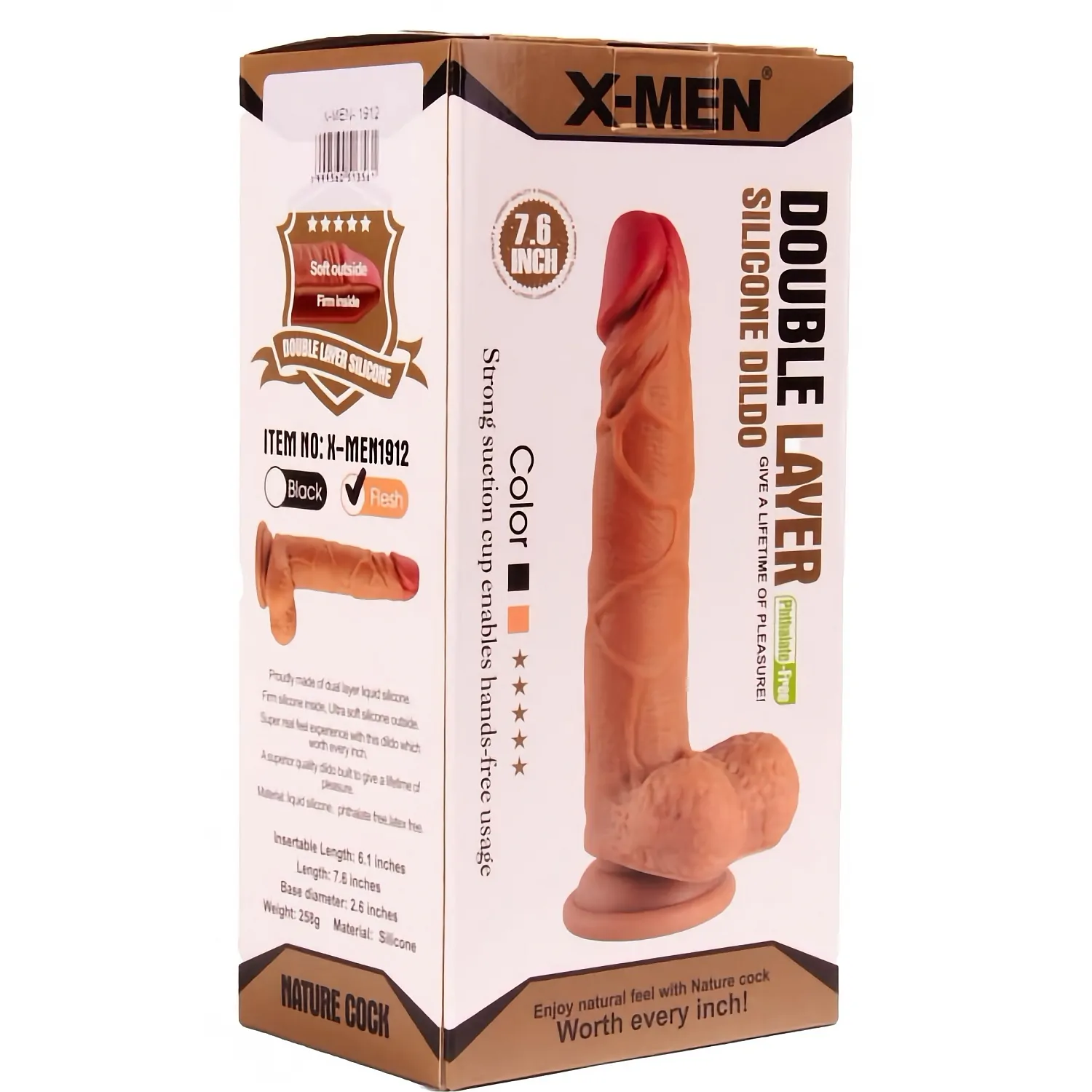 X-Men Nature Penis este un penis artificial ce are 19.3 cm lungime si 3.5 cm in diametru. Este facut din silicon de excepție superioara si are o colorație flesh spre maro. Este prevazut cu scrot realistic ce creste nivelul de realism. Cu ajutorul acestuia poti manevra mai usor jucaria. La baza are o ventuza puternica cu susținerea careia poti lipi dildoul de absolut orice suprafata, pentru o experienta libera.