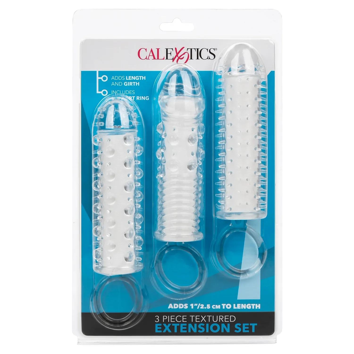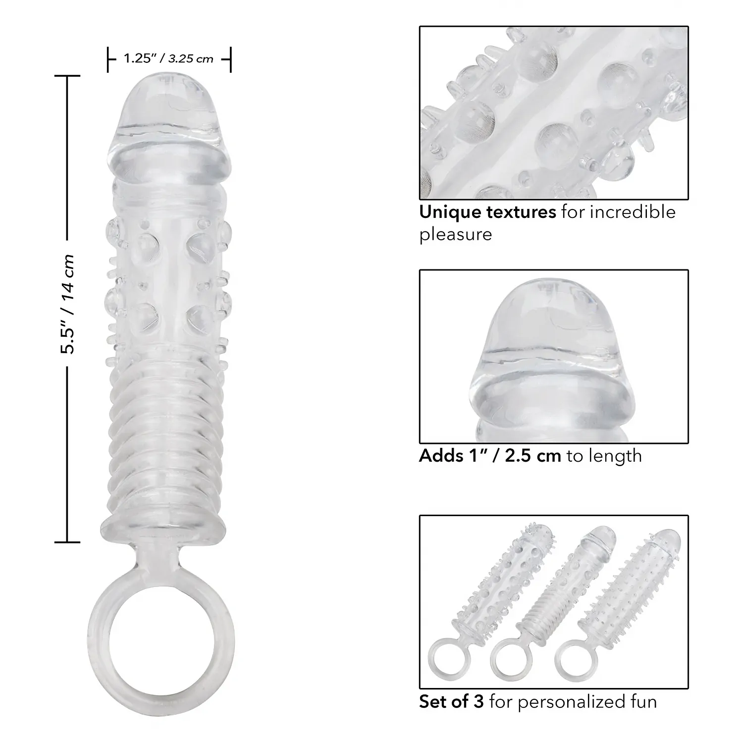 Fiecare cuprinzând o formă și o textură unică, cele trei mâneci incluse în kitul de extensie pentru penis din 3 componente de la CalExotics adaugă tone de senzație suplimentară și cam un centimetru mărime unui penis (sau dildo sau vibrație) la alegere.