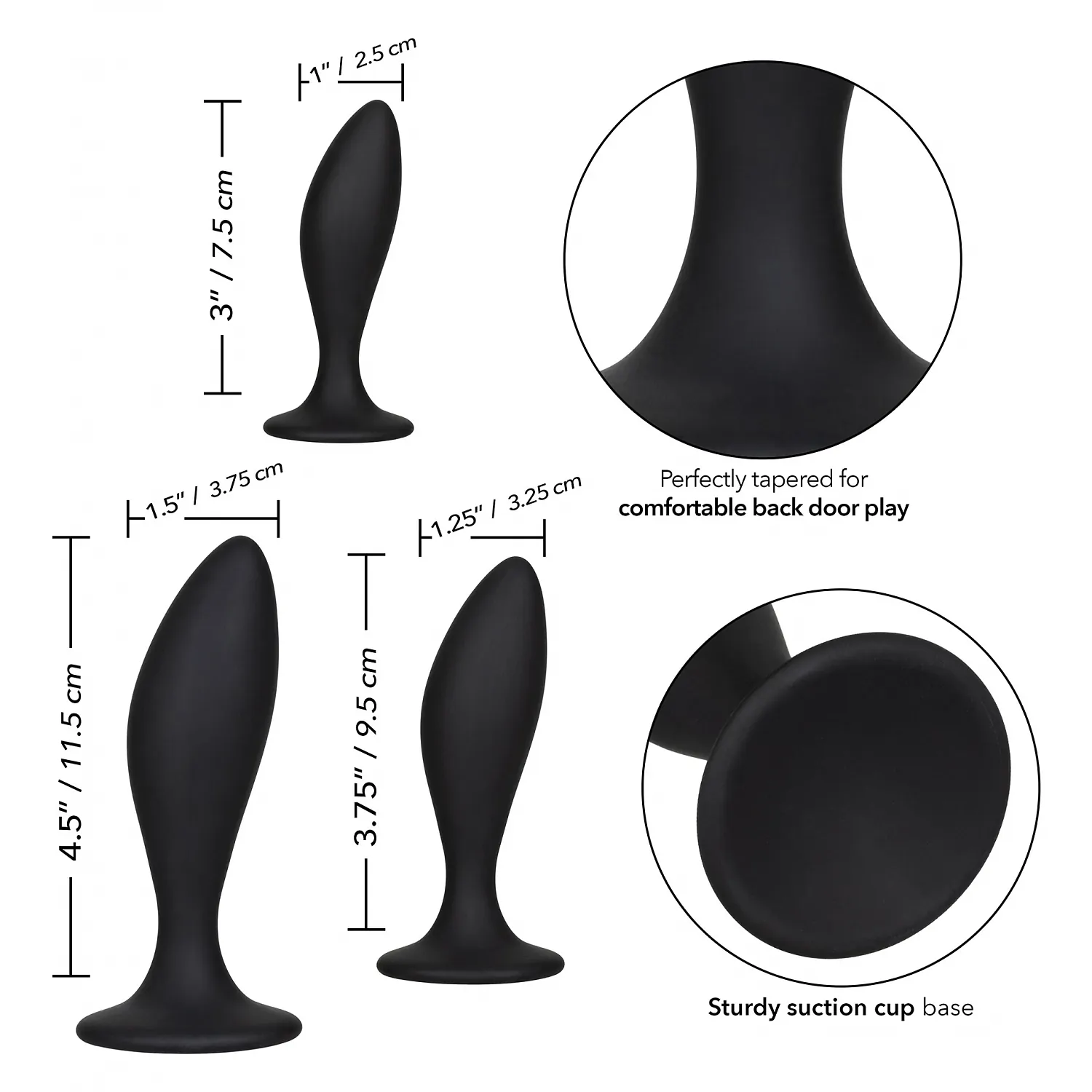 Deschide-te înspre o lume a plăcerii anale palpitante cu kitul Silicone Anal CalExotics. Răsfățați-vă plăcerea tremurând genunchii cu setul de 3 mărimi gradate de dopuri anale ușor curbate cu baze de ventuză.