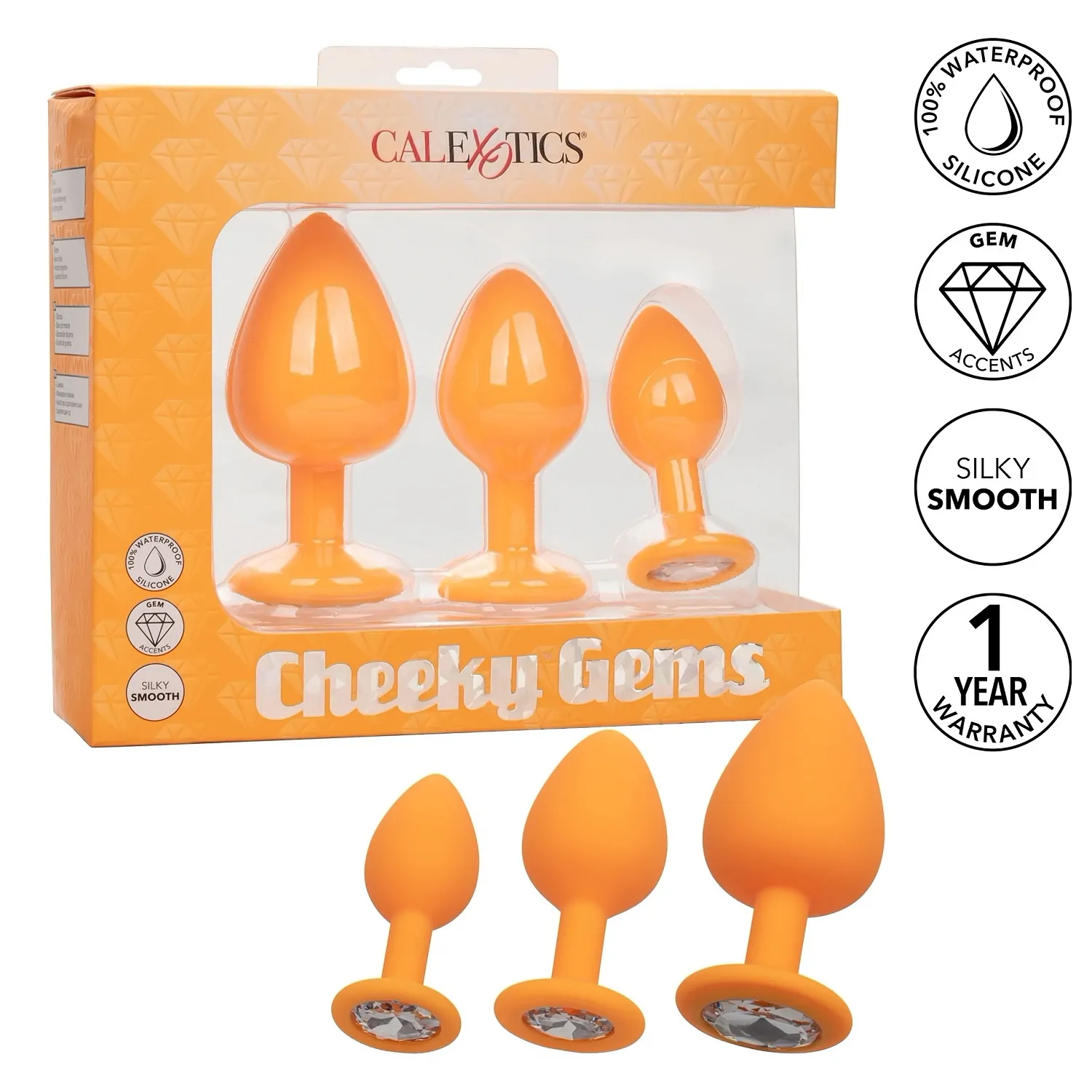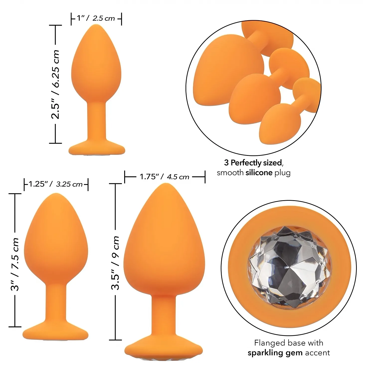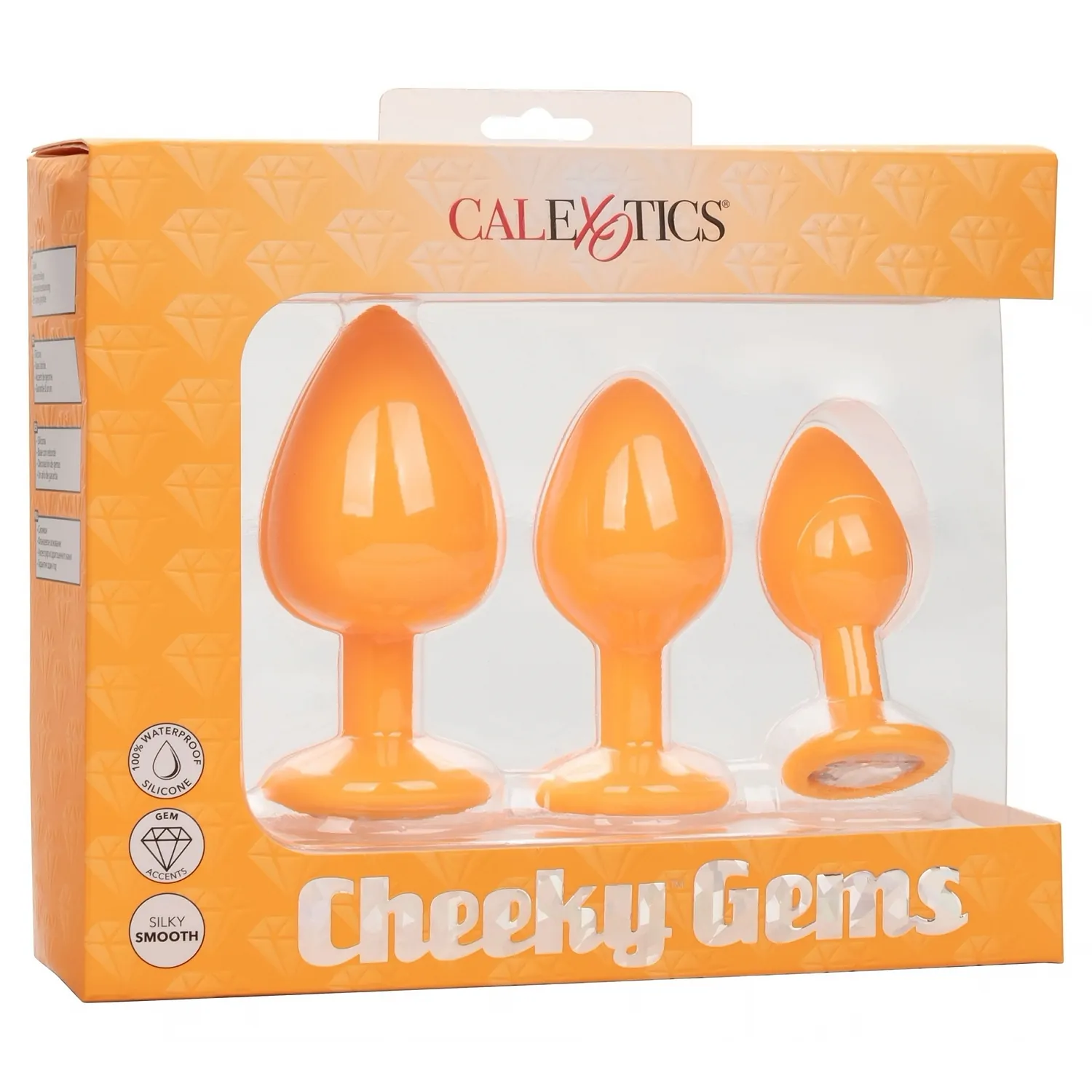 Deschide-te în lumea fabuloasă a satisfacerii ușilor din spate cu Cheeky Gems Portocaliu. Trusă de antrenament anal glamour conține un set de 3 dopuri anale gradate cu o bază de bijuterie pentru a vă permite să creșteți în siguranță și comod stimularea anale pasională.