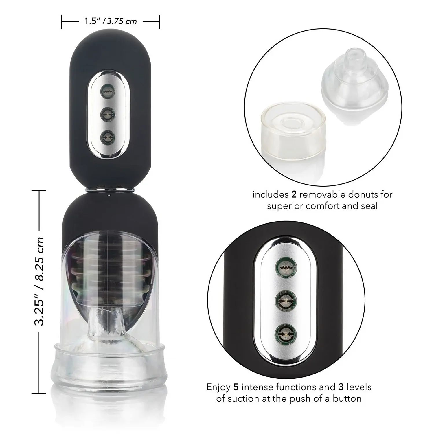 Această pompă de înaltă tehnologie, complet automată transmite 3 nivele de aspirație intensă, 5 funcții de vibrație și o pernă de vibrații pentru rezultate cu adevărat nemaiîntâlnit.