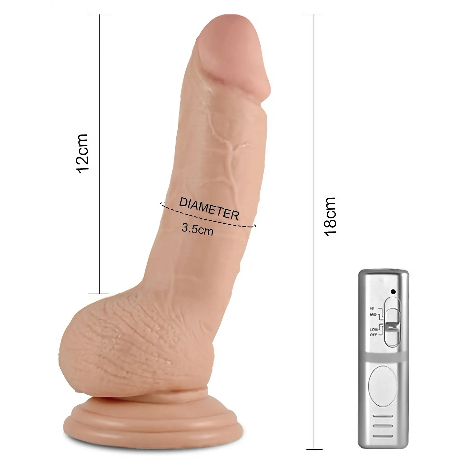 - Dildo-ul are 3 viteze de vibrație. - Are un vârf rotunjit în formă de gland și un ax gros cu vene proeminente. - Este ideal pentru cei care apreciază o textură realistică combinată cu o extindere și grosime peste medie. - Materialele sunt sigure pentru tegument și fără ftalați. - Axul ferm dar flexibil oferă o suprafață ce răspunde la temperatură pentru senzații excepțional de realiste. - Detaliat cu fiecare rid și adâncitură așteptată pe un bărbat real, setul de testicule bombate stimulează extern pentru a autentifica experiența jocului. - Este corespunzător cu hamuri, fiind adecvat pentru aventuri strap-on.