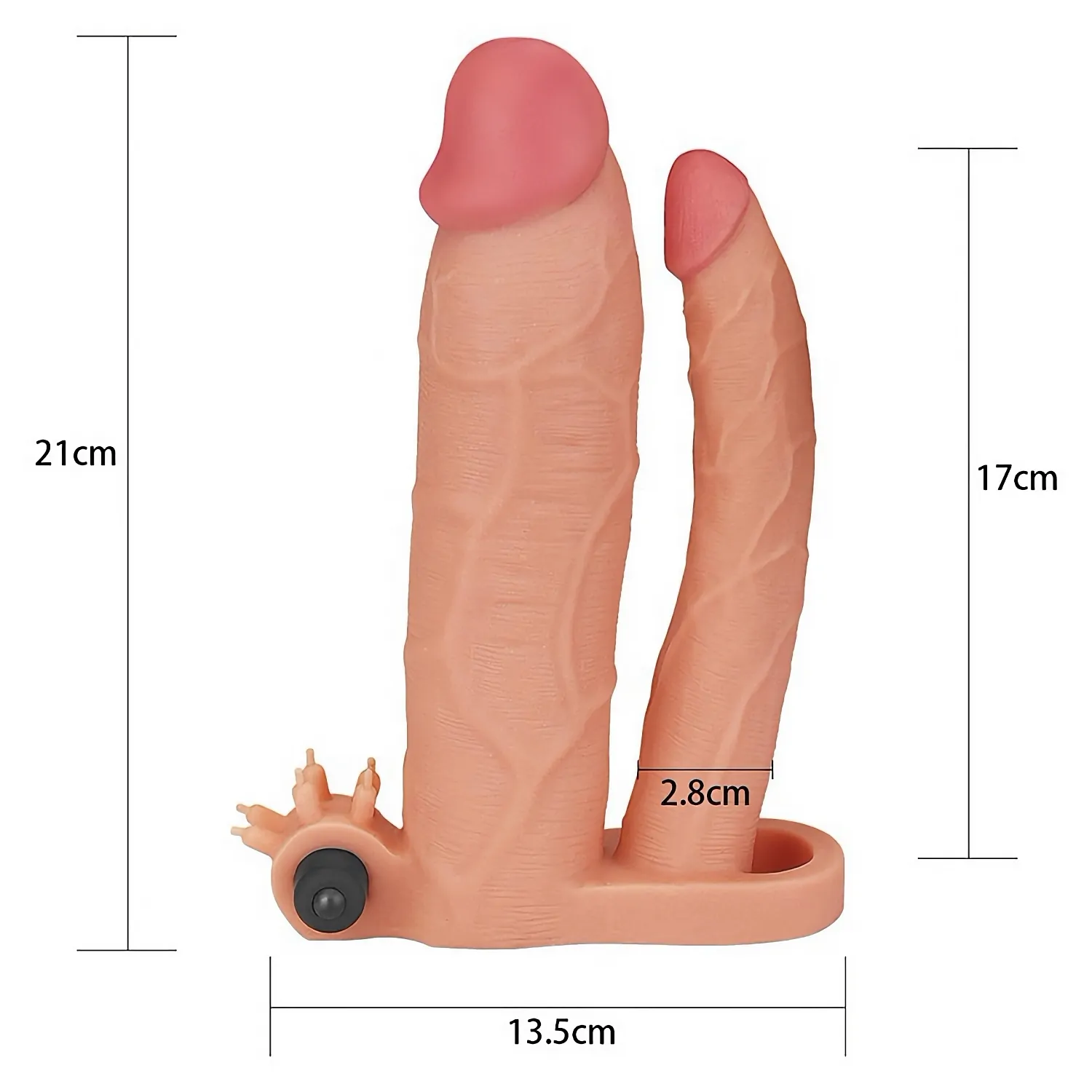 Prelungitor Dublu Penis Add 3 Vibrating este un prelungitor pentru penis din TPE ce are 21 cm mărime iar în diametru 5 cm. Odată pus pe penis, aceasta jucărie prelungește organul genital, adăugând câțiva centimetri în plus în lungime, dar și în grosime.