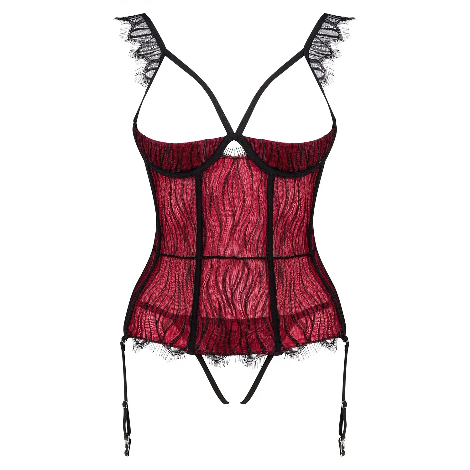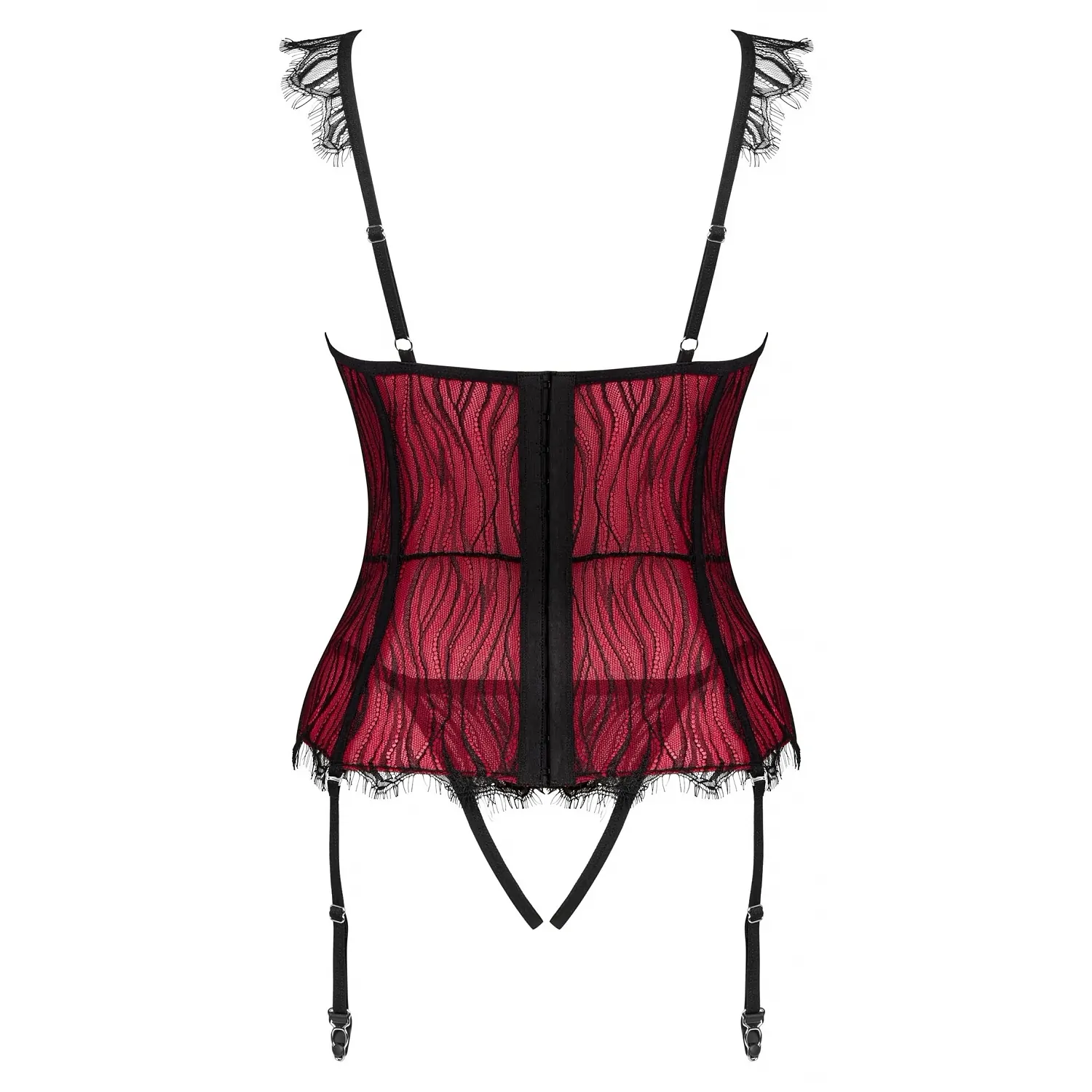 Un corset provocant însușit cu balene verticale întărite, meșteșugit dintr-un material ușor lucios de culoare roșie acoperit cu o dantelă fină de colorație neagră.