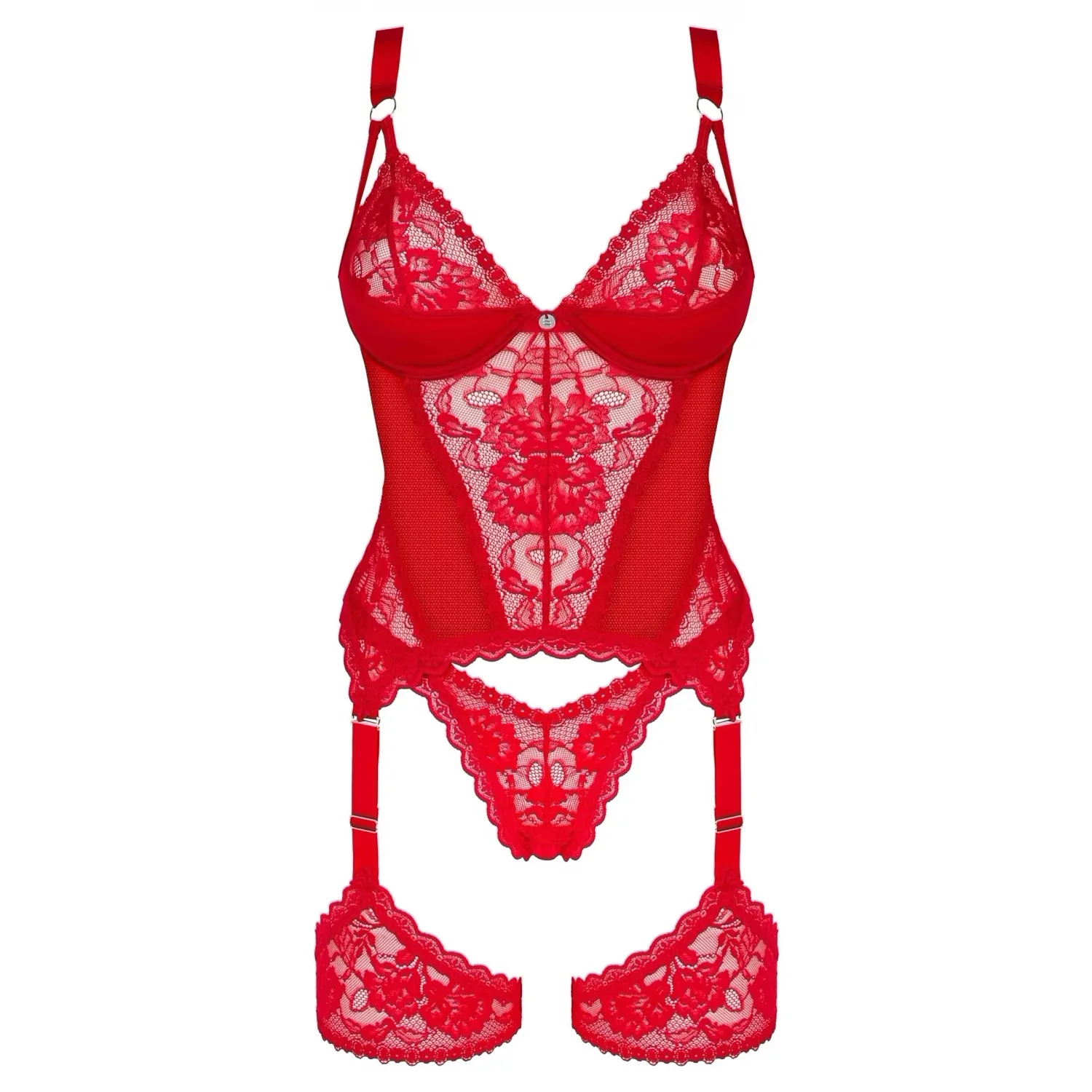 Un corset incredibil de wow, care tentează prin culoarea sa pasională și impresionează prin croiala sa unică. Croiul senzual, clasic, subliniază perfect pieptul și decolteul, iar cupele prevăzute cu sârmă de sprijinire vor ridica și ajută ideal sânii. Chilotul asortat și portjartierul din dantelă vor completa angelic ținuta. Articolul este fabricat dintr-o țesătura elastică.