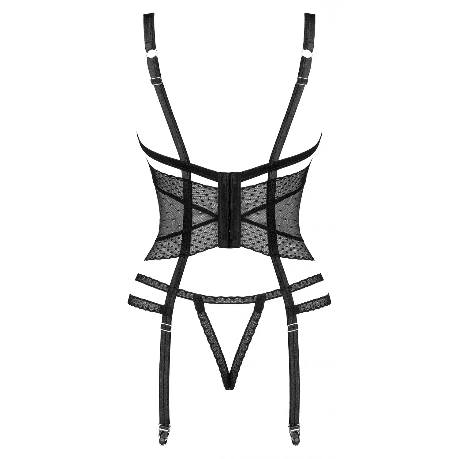 Un corset provocant cu brâu atașat, fabricat din tul fin şi elastic. În zona sânilor are decupaje şi este uşor buretat oferind articolului un aer aparte. Sârmele de sprijinire prezente în cupe, subliniază în mod eficace bustul, făcându-l să pară mai plin. Bretelele sunt reglabile pentru o ajustare perfectă, iar chilotul conceput doar din benzi elastice fac din acest produs finit un must-have pentru o noapte incitantă. Produsul este construit dintr-un material cu elasticitate.