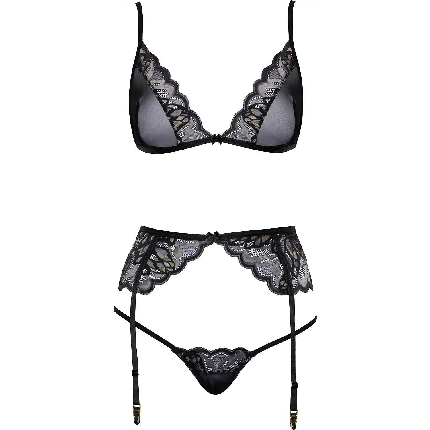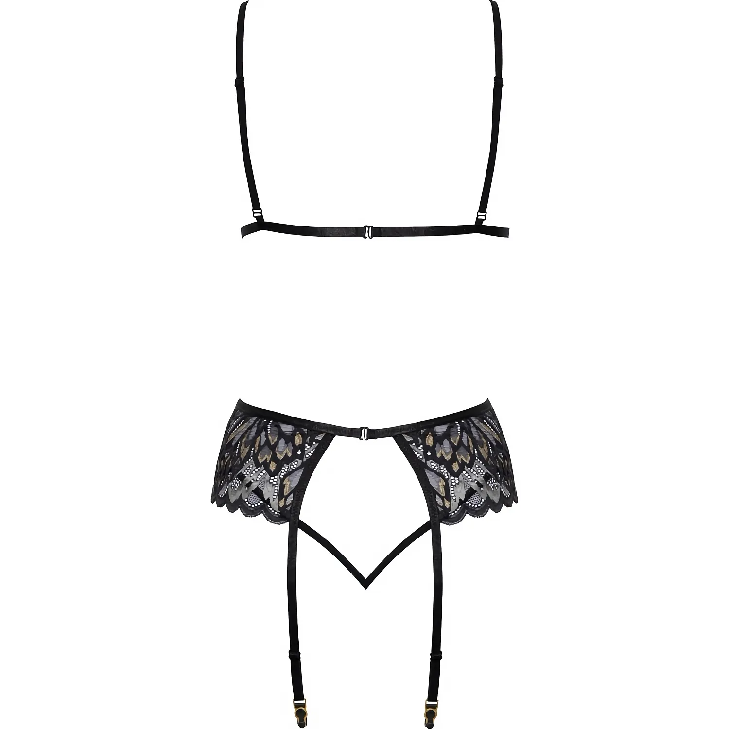 Toate piesele sunt moi și elastice pentru o potrivire foarte confortabilă. Sutienul are bretele ajustabile și o prindere cu cârlig la spate. Portjartierul are, de asemenea, o prindere cu cârlig la spate și bretele reglabile. Panty-ul mic, fantezist, este foarte seducător pentru că are două bretele înguste, elastice, care se îmbină în zona picioarelor. Ciorapii nu sunt incluse. Produsul este fabricat dintr-o țesătura elastică.
