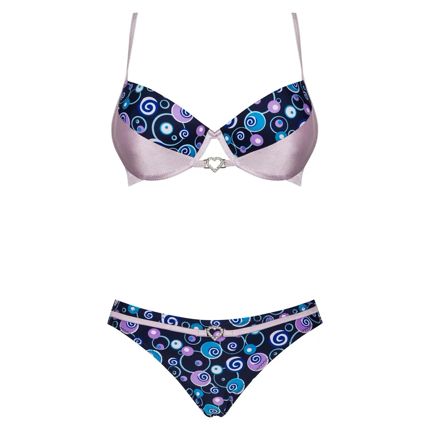 ținută de baie din două piese confecționat dintr-un material suav și ușor la atingere. Este accesorizat în partea de sus a sutienului și pe bikini cu două inimioare prevăzute cu pietre strălucitoare.