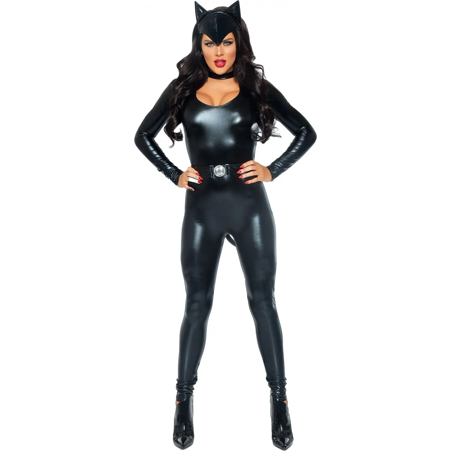 Set costum de felină frisky din 3 componente care include costum cu coadă atașată, centură, bentiță cu urechi.