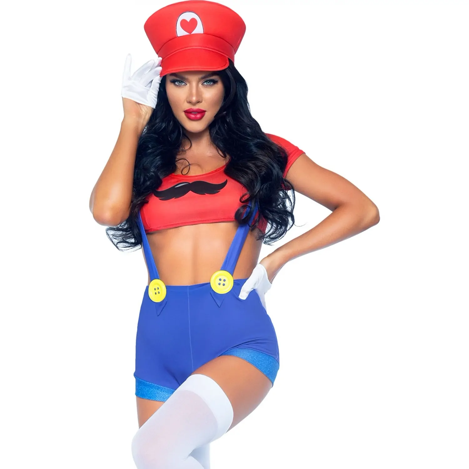 Gamer Babe are un crop top, pantaloni scurți cu bretele cu accente de simbol și pălărie. Ciorapii pot fi comandate separat.