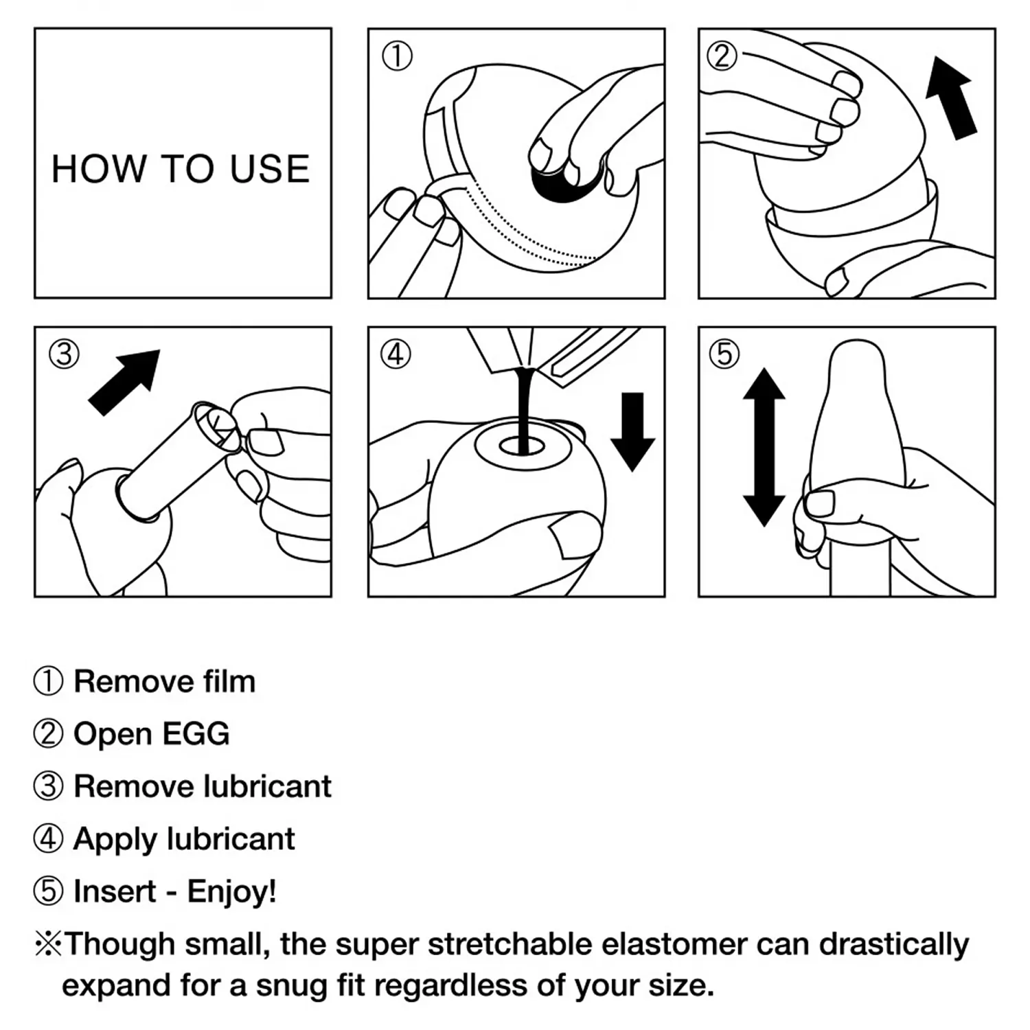 Tenga Egg Snow Crystal se remarcă prin utilizarea sa simplă și intuitivă. Desfaceți învelișul, deschideți coaja și găsiți în interiorul oului un plic cu agent lubrifiere EGG LOTION. Deschideți-l și turnați lubrifiantul în EGG. Puneți lubrifiantul și în jurul orificiului pentru o utilizare excluzând probleme. După finalizare, plasați materialul finit folosit înapoi în carcasă în configurație de ou și sigilați pentru eliminare.
