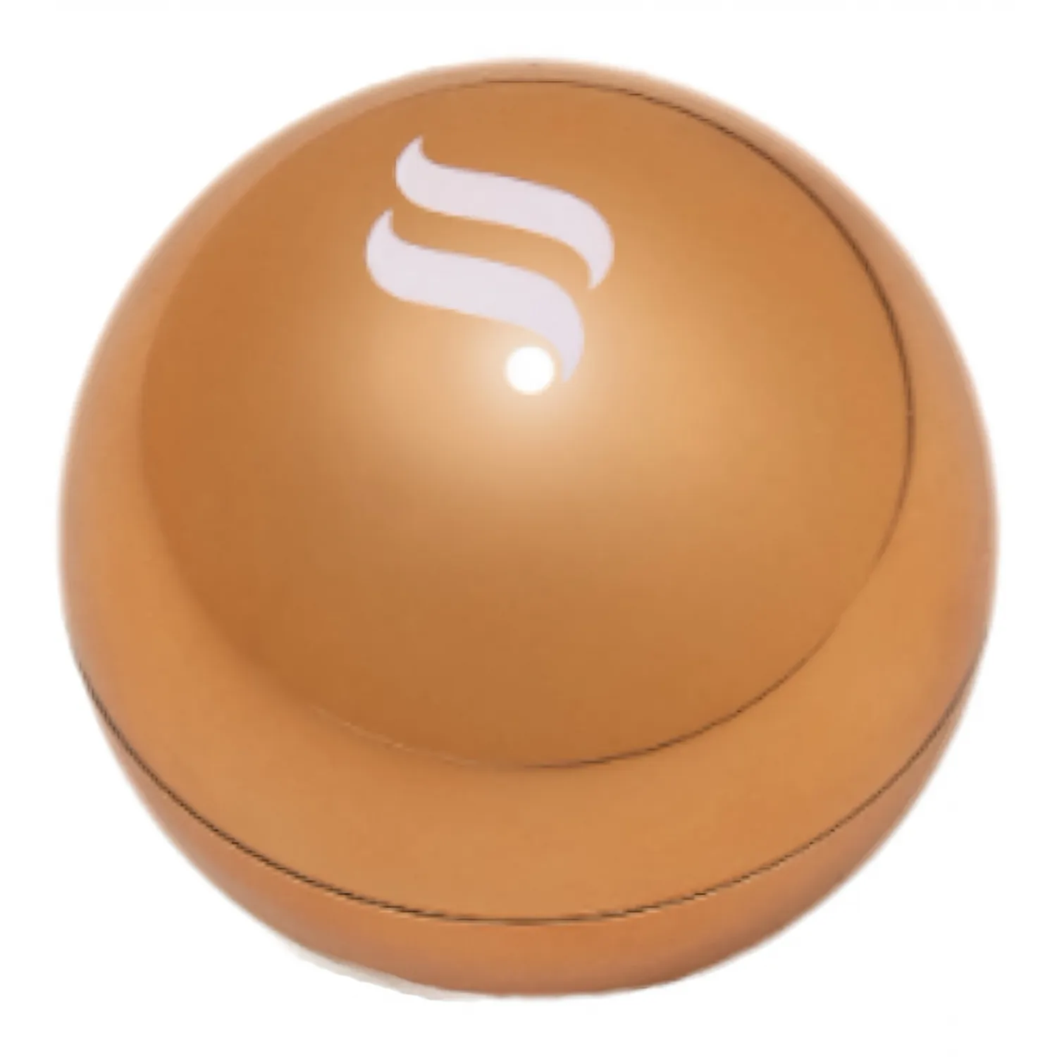 Recipientul elegant în formă de minge într-o colorație aurie are deasupra un logo subtil Obsessive.