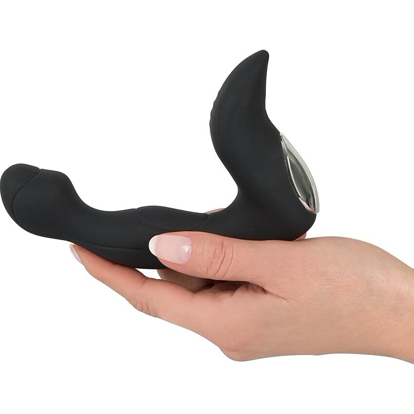 Micul dar de bucurie pentru prostată! Vibrator de prostată cu stimulator de perineu. Stimulează simultan prostată și perineul cu 10 moduri de vibrații intense. Vârful este deosebit de flexibil, ceea ce face inserția foarte ușoară. Formă interesantă cu vârful pronunțat și canelurile de stimulare oferă stimulare suplimentară.