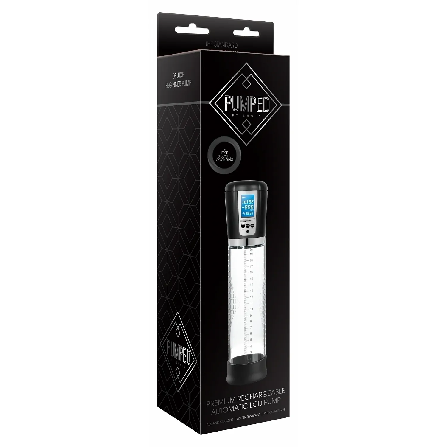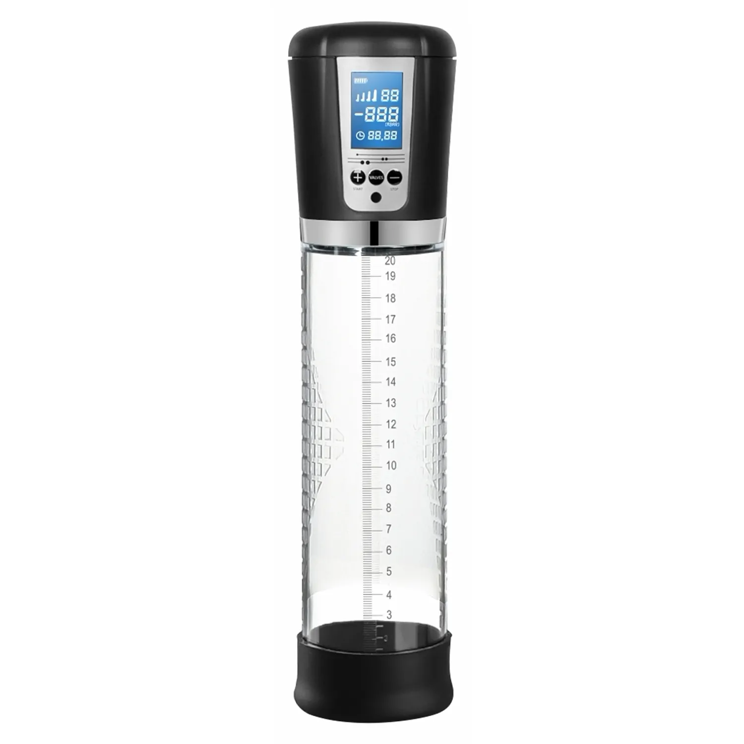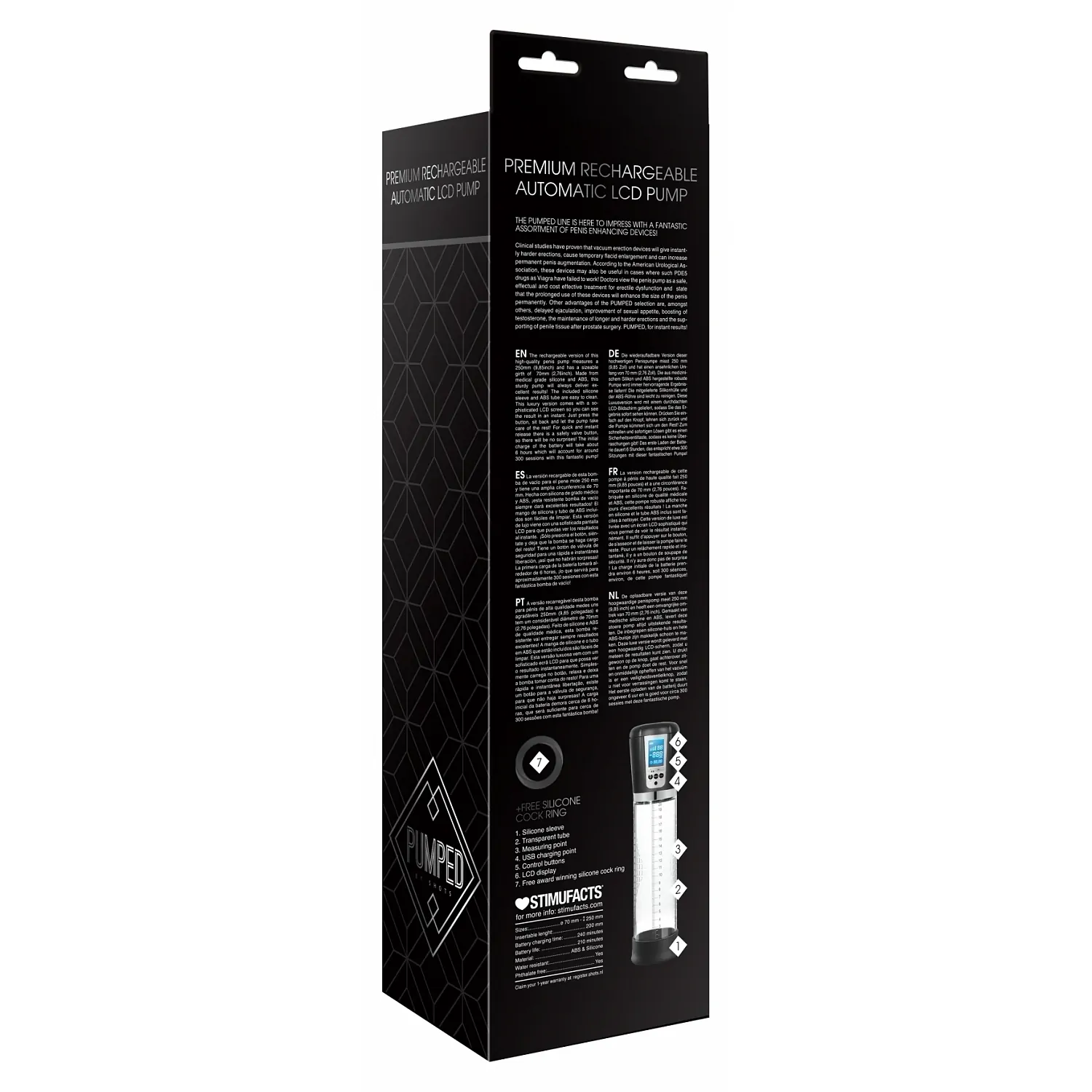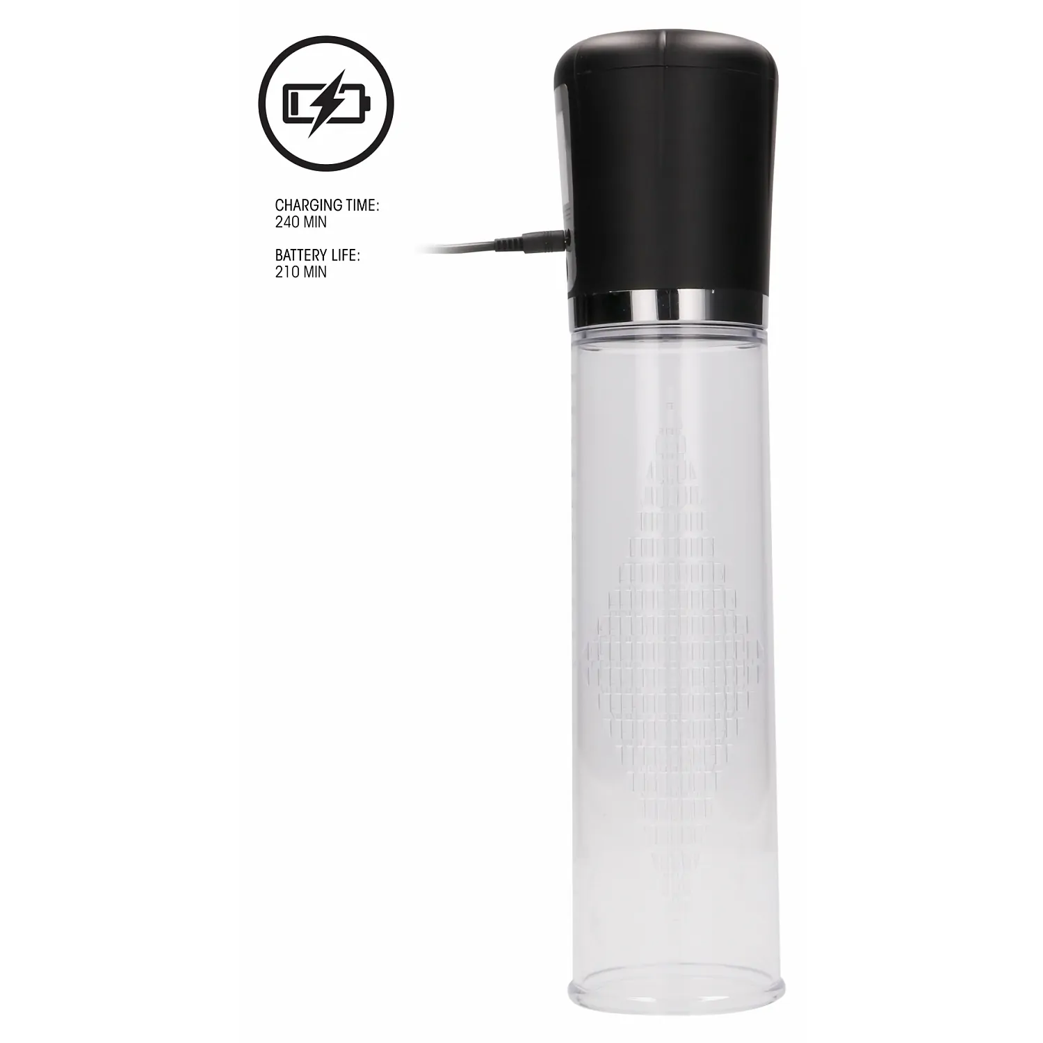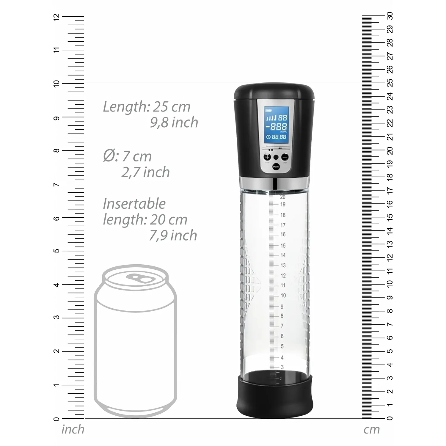 Versiunea reîncărcabilă a acestei pompe pentru penis de înaltă calitate măsoară 25 cm și are o circumferință considerabilă de 7 cm.