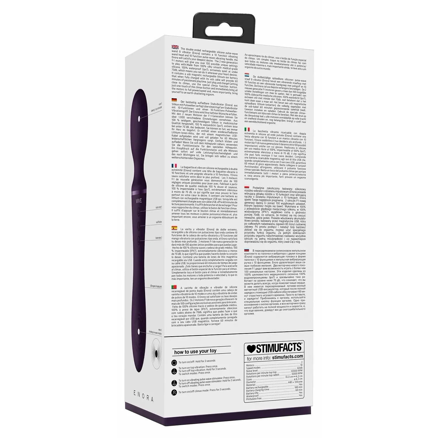 ENORA, baghetă și vibrator cu două capete, se mândrește atât cu un capăt vibrant cât și cu tijă cu 10 aplicații de vibrații, făcându-l un instrument perfect pentru plăcere.