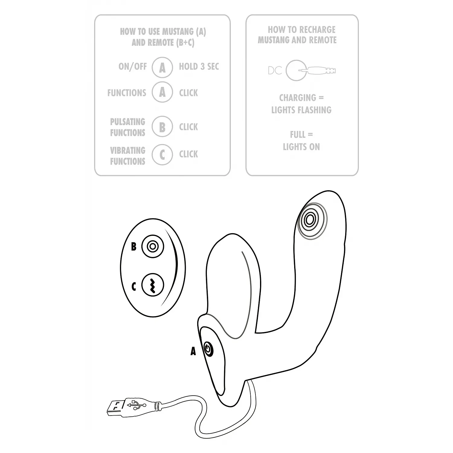 Mustang conține de două motoare: un motor vibrator și pulsatoriu pentru stârnirea maximă a prostatei și un motor vibrant pentru stimularea perineului. Vine cu o telecomandă pentru distracție cu mâinile libere sau predă controlul partenerului tău.