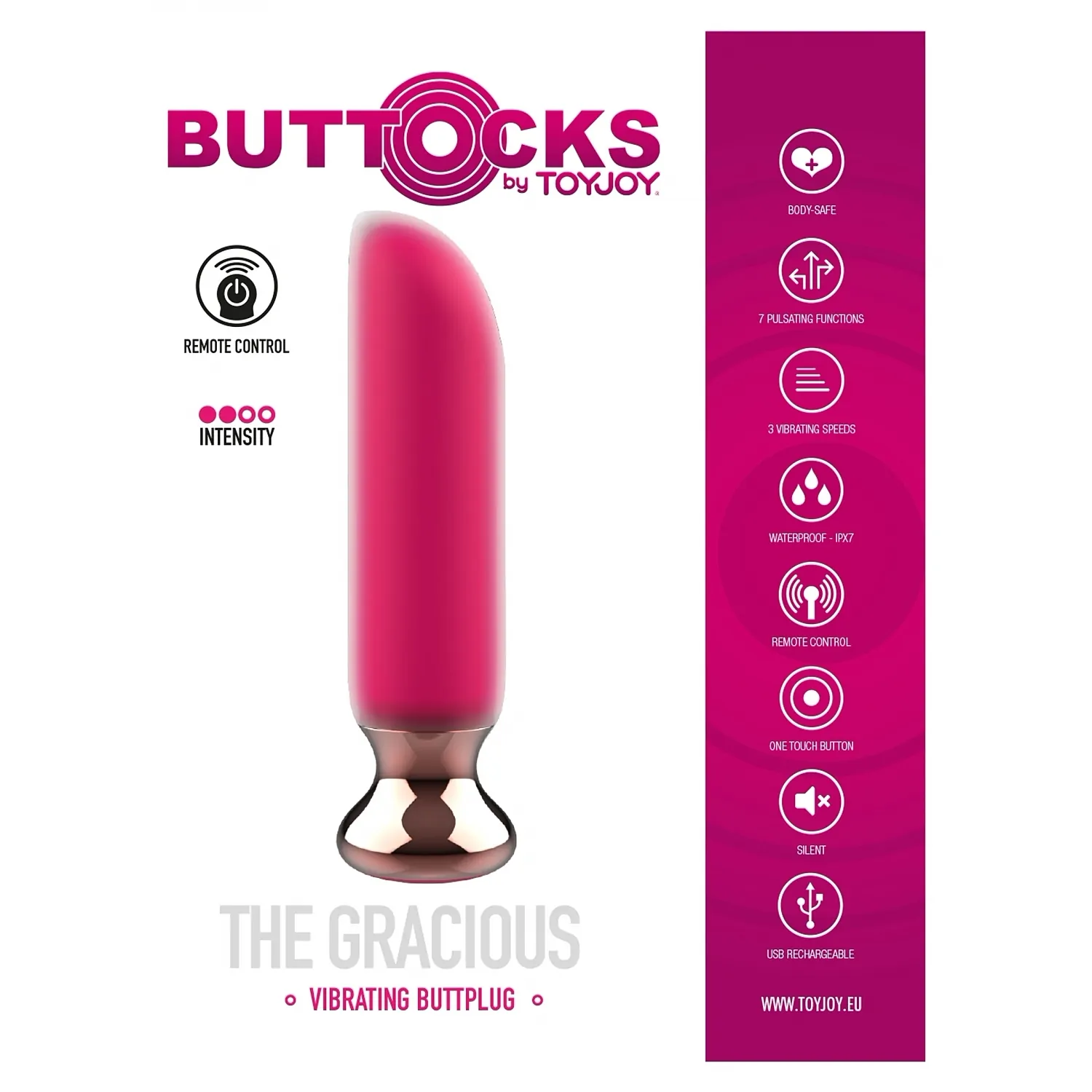 Gracious este un plug anal vibrant, roz ce conține de un motor intens cu 7 maniere distincte de vibrații și 3 viteze Fiecare mod oferă vibrații zgomotoase profunde, care sunt ușor de controlat pe obiect sau cu telecomandă inclusă.