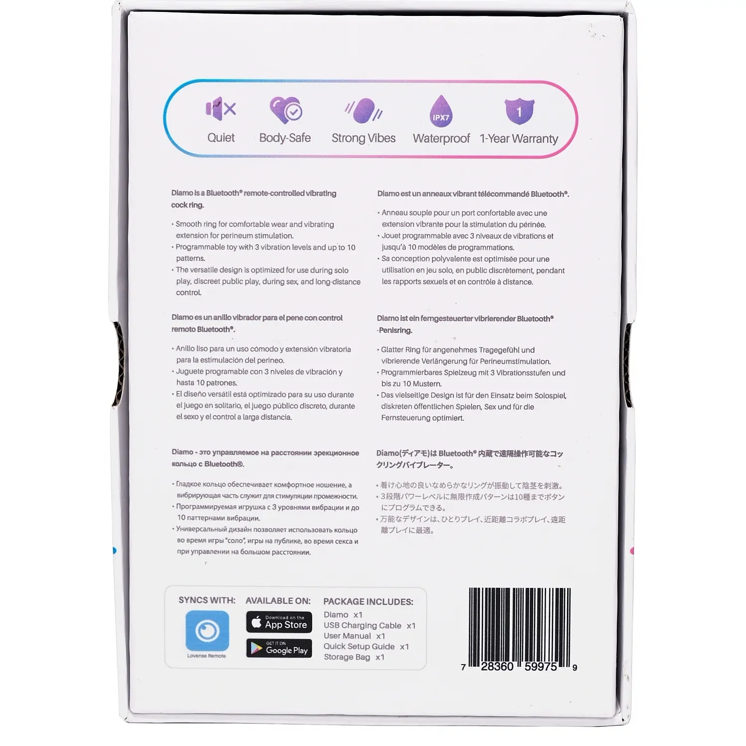 Este comod în purtare, oferă o sculare mai dură, de durată mai lungă și crește rezistența sexuală. Din cauza designului său versatil, Diamo oferă o stârnire puternică vizată pe perineul purtătorului său sau pe clitorisul nevestei în momentul sexului de cuplu.Vibrațiile pătrunzătoare ale acestei jucării pot fi controlate cu ușurință prin intermediul telefonului utilizând aplicația sau la distanță prin intermediul internetului. Poate crea o gamă variată de vibrații, deoarece reacționează la stimuli tactili și vocali.