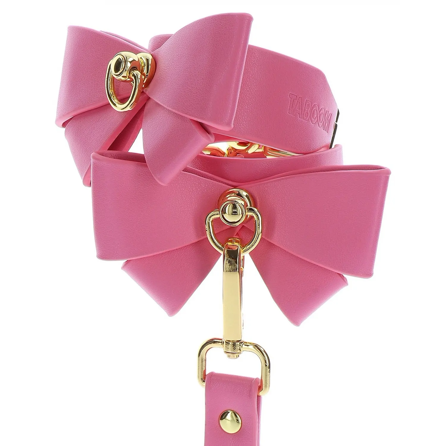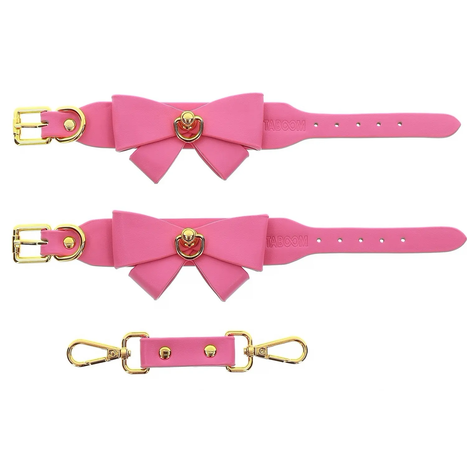Îmbrățișează-ți partea jucăușă cu aceste manșete din piele PU vegană roz, împodobite cu fundă și detalii metalice aurii. Îmbină stilul și plăcerea, explorează mulțimea sclaviei sau poartă-le ca o declarație de modă.