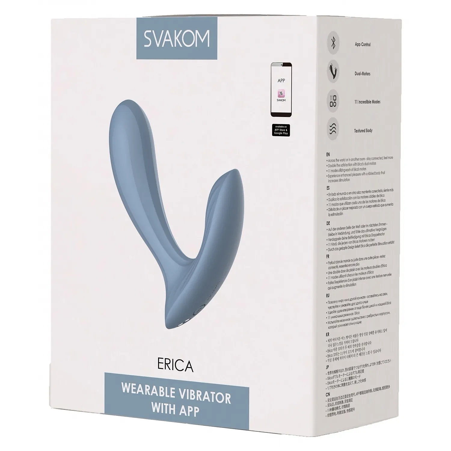 Svakom Erica Wearable Vibrator Albastru furnizează stimulare internă și externă cu două motoare puternice și 11 maniere variate. Realizat din silicon lichid moale, se adaptează perfect corpului. Designul maleabil și ergonomic aduce confortul, iar aplicația dedicată îngăduie control global de la distanță.