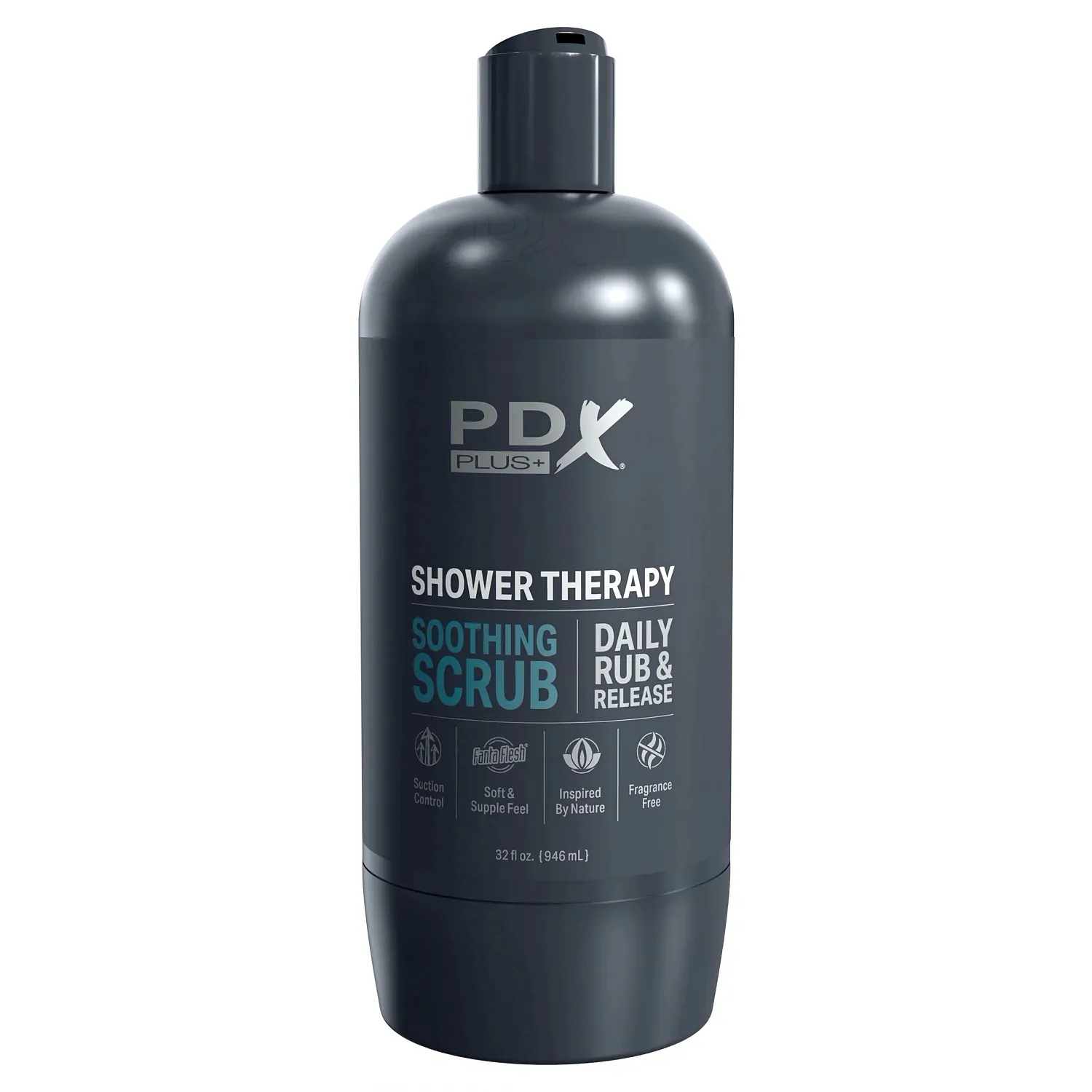 Shower Therapy Soothing Scrub Natural este un dispozitiv discret, camuflat într-un recipient ce imită o sticlă de șampon. Include un interior texturat din material Fanta Flesh, flexibil și termo adaptabil. Mecanismul integrat permite reglarea intensității, iar componentele sunt ușor de curățat.