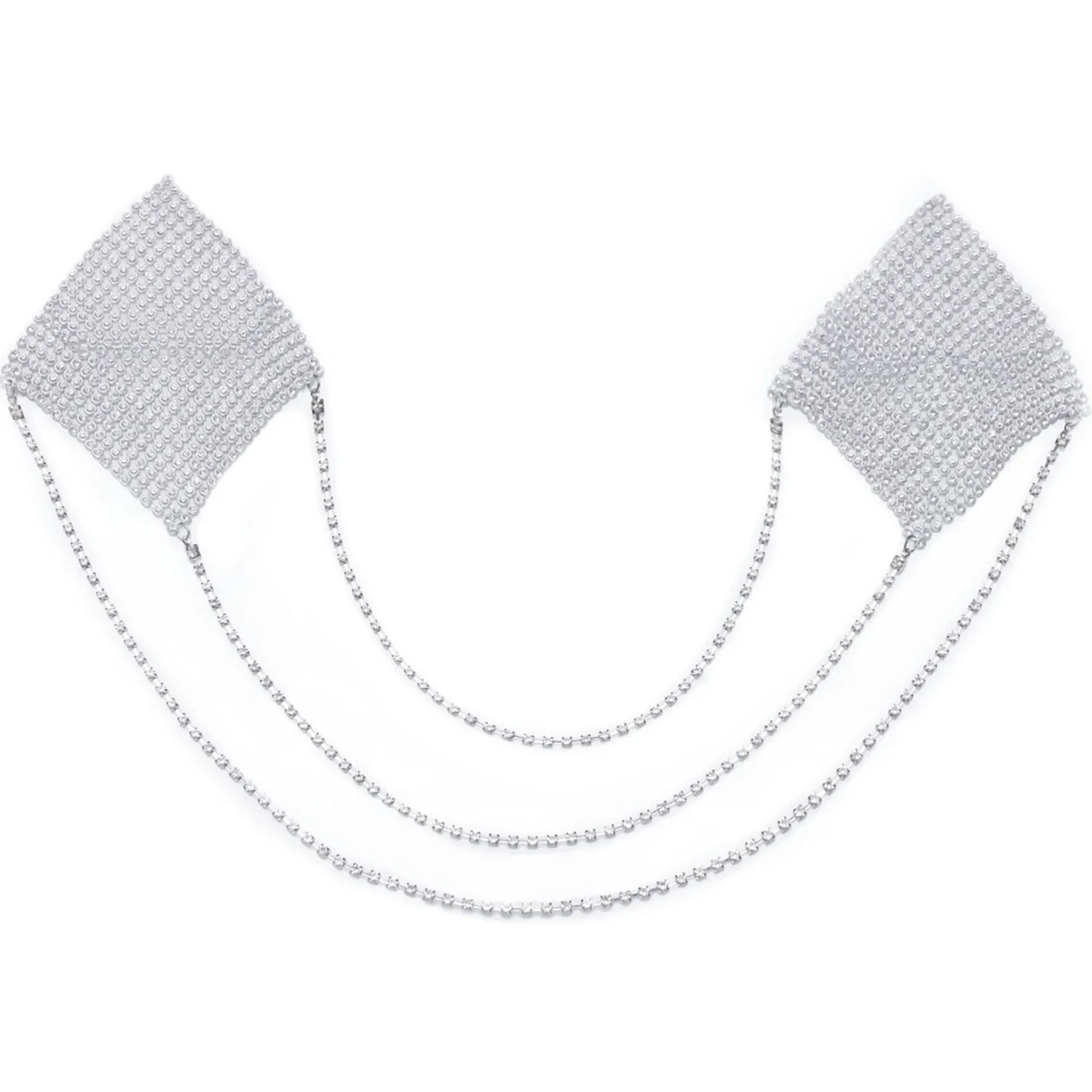Descoperiți strălucirea sofisticată a Stickers-urilor pentru mamelon Cottelli, o alegere rafinată îmbogățită de un stil elegant. Aceste podoabe atrăgătoare sunt realizate dintr-o nuanță argintie care captează lumina, evidențiind forma lor impresionantă inspirată de diamante. Fiecare sticker se distinge prin detalii meticuloase, prezentând trei lanțuri delicate care crește o notă de eleganță și dinamism.