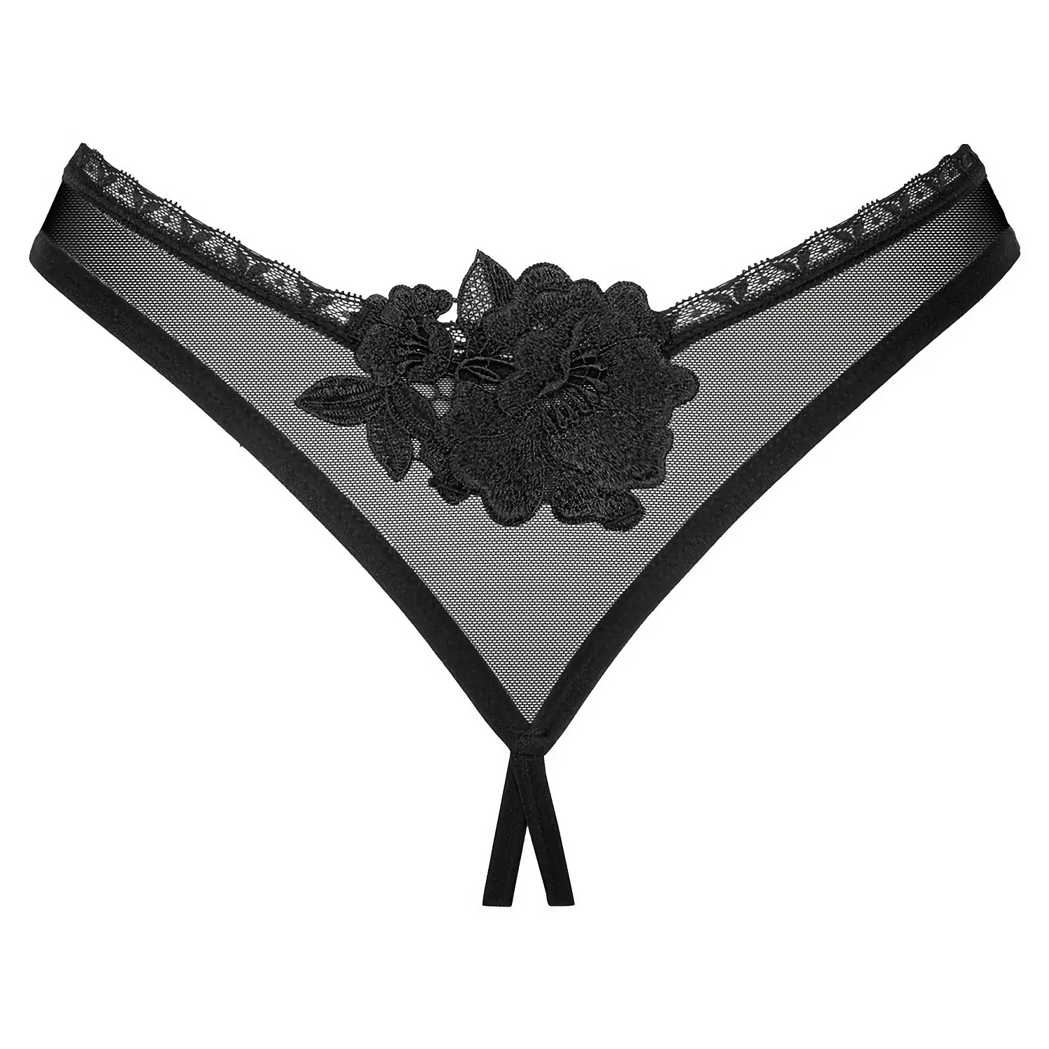 Descoperiți thong-ul Latinesa de la Obsessive, o creație din tulle elastic negru-transparent, cu volănaș rafinată și un element decorativ subtil pe talie. Designul său inovator posedă deschideri strategice, completate de broderii elaborate. Structură materialului conține 94% poliamidă și 6% spandex, oferind confort și adaptabilitate perfectă.