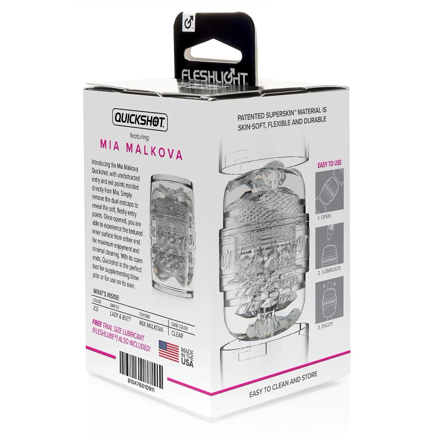 Quickshot Mia Malkova Fleshlight, compact 11 cm, cu orificii modelate după trăsăturile Miei Malkova. Miez din SuperSkin cu texturi variate pentru stimulare realistă; portabil și discret. Ușor de curățat; atenție la diametrul intern (max ~4.9 cm).
