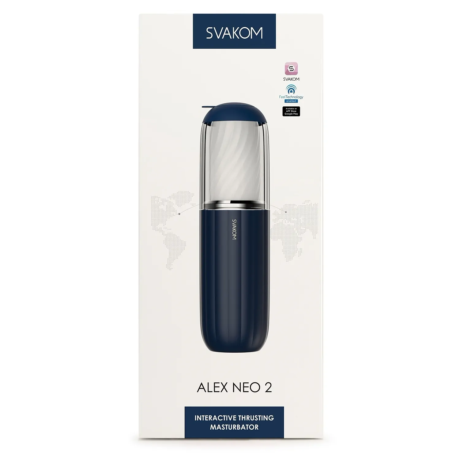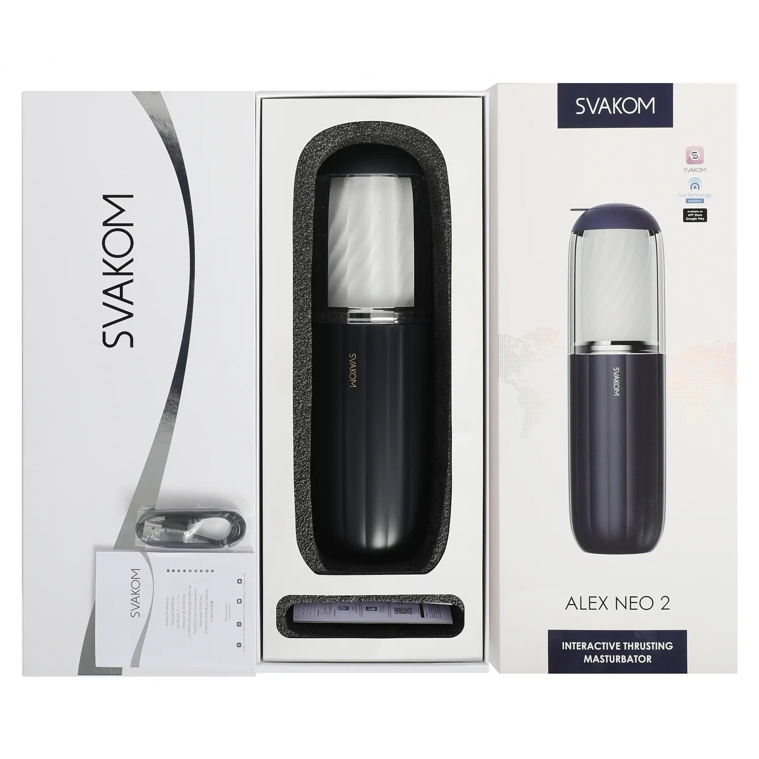 Alex Neo 2 de la Svakom: masturbator cu acumulator cu 7 feluri de împingere, manșon detașabil din TPE ultra-moale, control prin aplicație și opțiune de control la distanță. Estetică compact pentru utilizare confortabilă și spălare facilă.