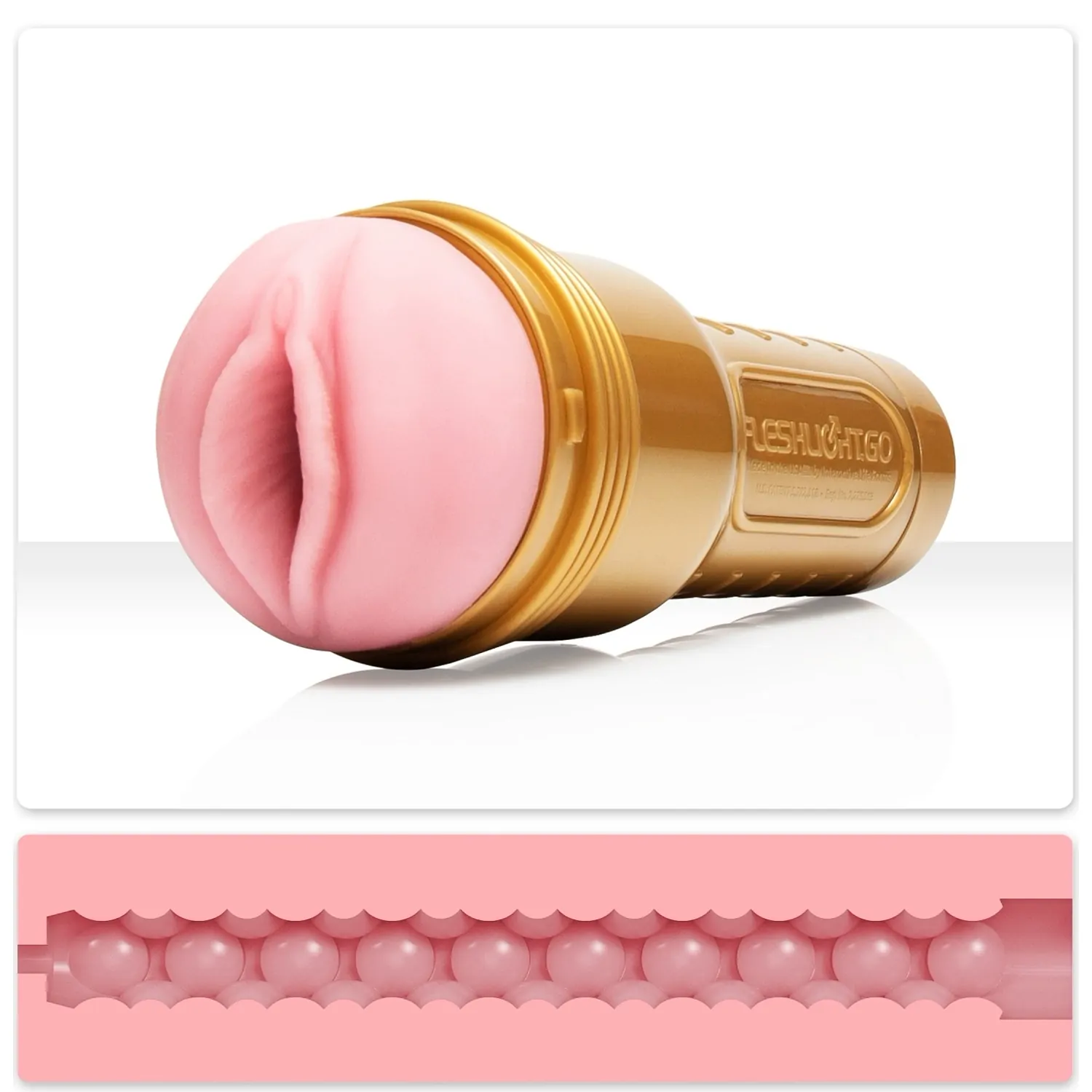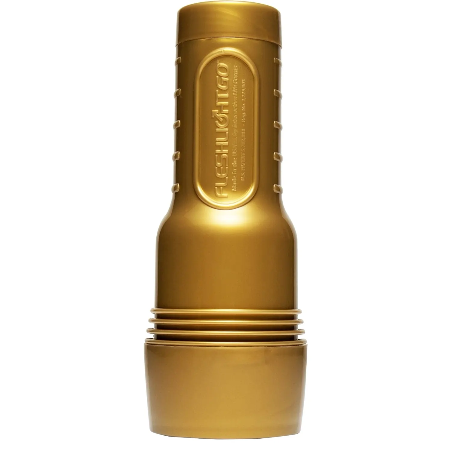Unitate portabilă Fleshlight GO Stamina: design compact cu manșetă SuperSkin pentru antrenament personal ce susține la creșterea rezistenței și perfecționarea tehnicii. Carcasă aurie discretă, ușor de curățat; extindere totală 18 cm.