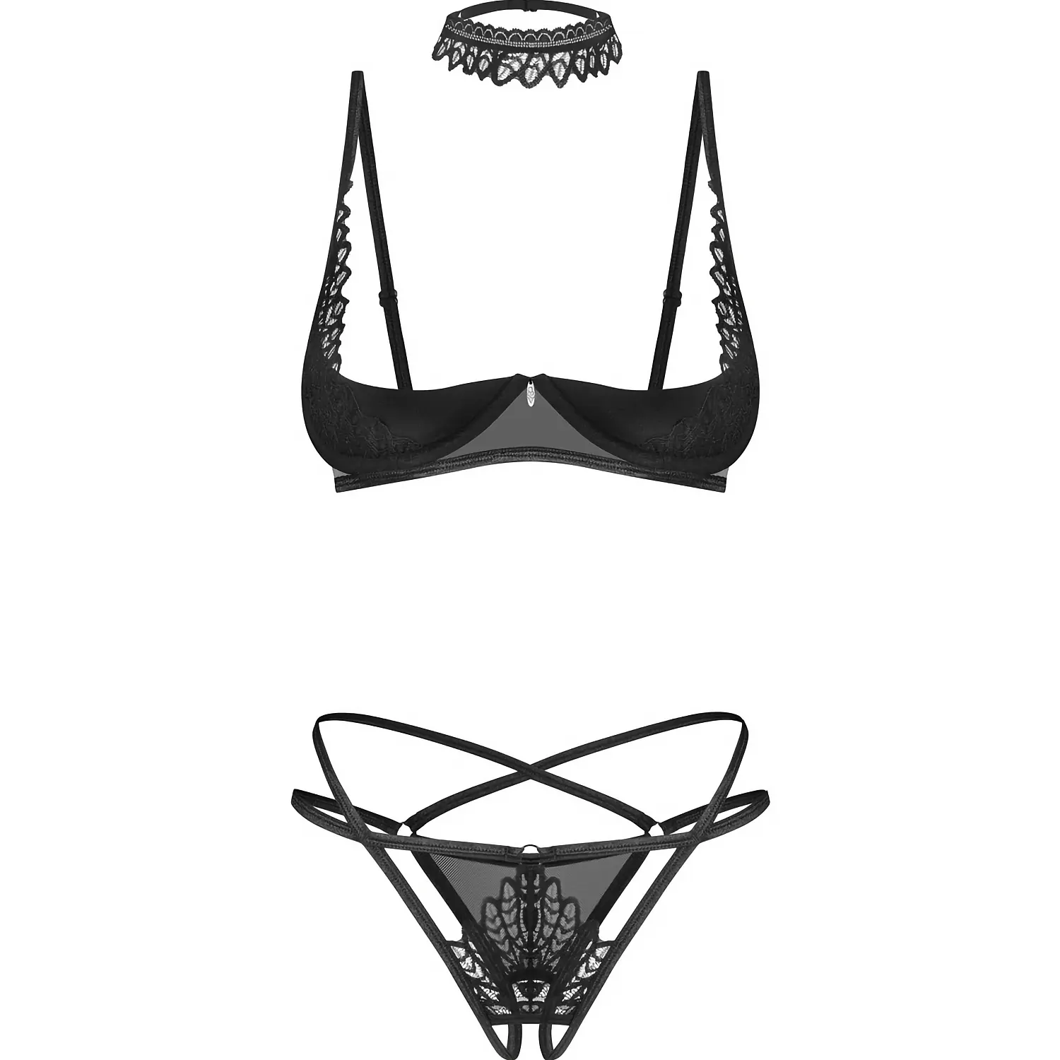 Obsessive Donarella, set 3 piese: bustieră semiacoperitor cu cupe cu arcuri, chilot cu ață cu decupare inghinal şi choker reglabil cu pandantiv. Volănaș cu pretext vegetal şi material elastic pentru confort şi contur. Fabricat în UE, lipsit de nichel.