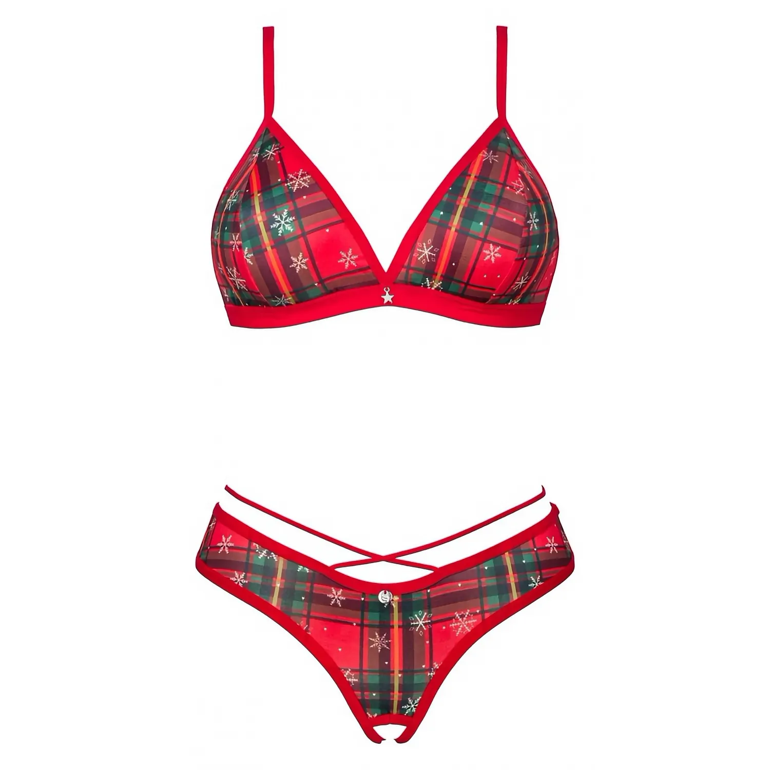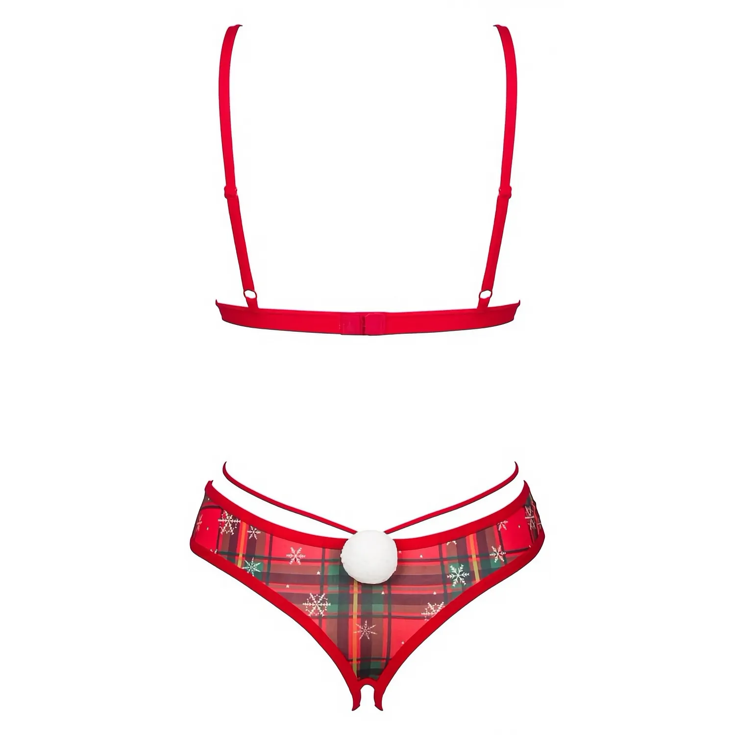 Set Ms. Merrilo de la Obsessive: bustieră fără armătură și chilot decupat, din tulle elastic cu tip în carouri și fulgi albi. Bretele reglabile, pandantiv aurit și pompon pufos la spate. Confort neted și potrivire elastică.