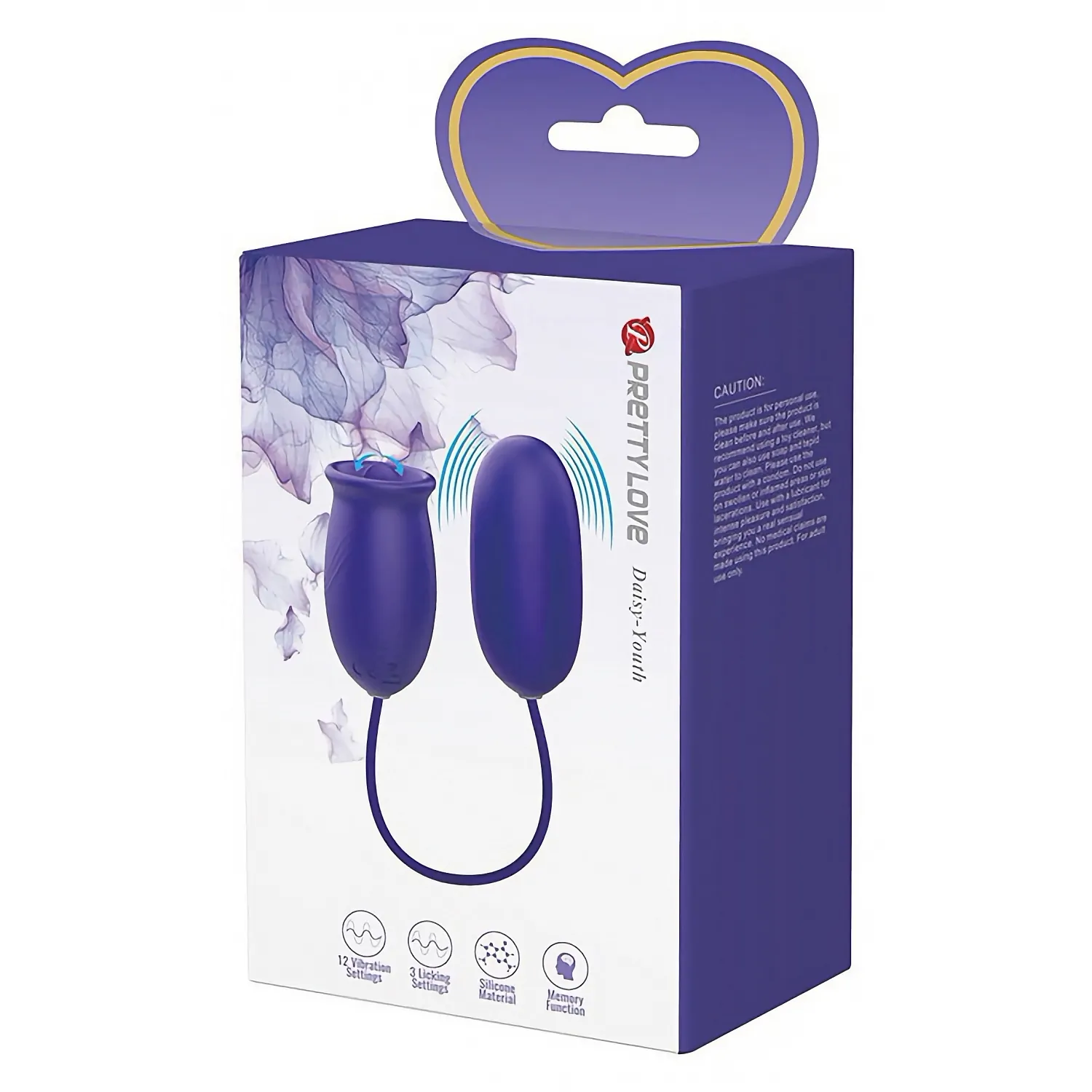 Vibrator Pretty Love Daisy Youth, reîncărcabil, din silicon catifelat. 12 moduri de vibraţie, 3 funcţii de lins, memorie pentru setarea preferată. Autonomie ~60 min, încărcare 120 min. Design discret și ergonomic.