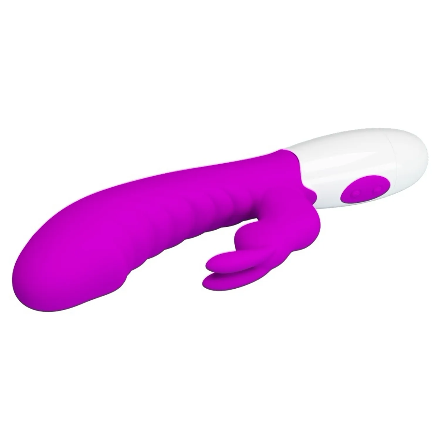 Stimulator dual Pretty Love pentru punctul G şi clitoris, cu stil elastic care menţine contactul. 30 chipuri de vibraţie, alimentare pe baterii şi comenzi simple pentru reglaj rapid.