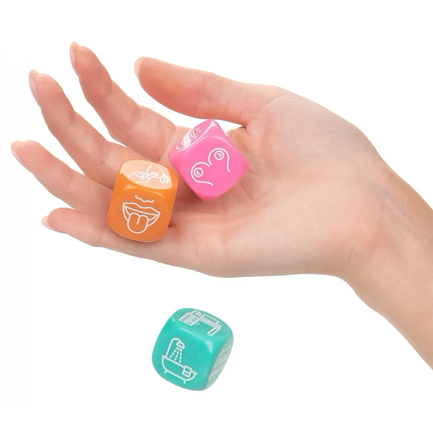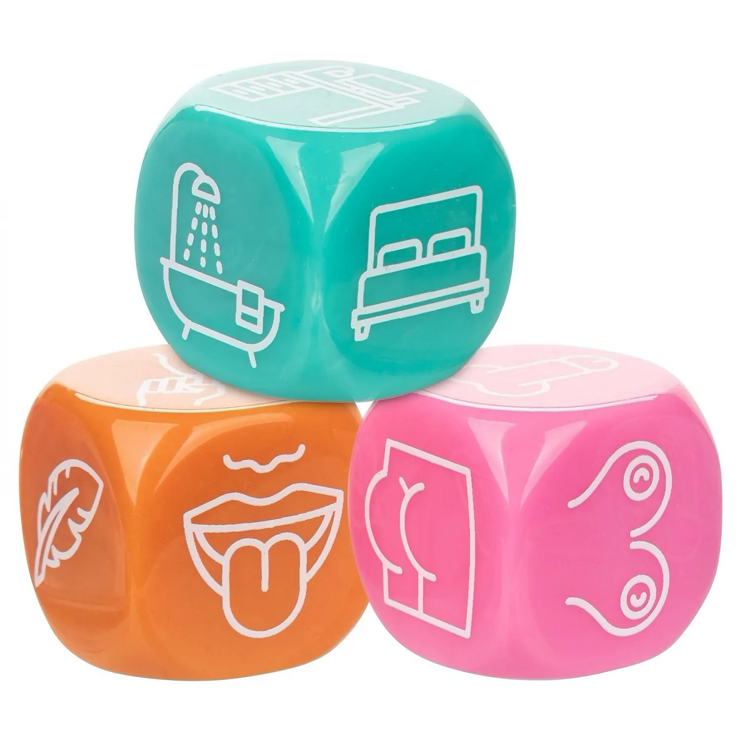 Set compact Roll With It de la CalExotics: 3 zaruri din acrilic pentru a stabili iute partea, acțiunea și locul. Tacit, reutilizabil și ușor de păstrat pe noptieră. Pentru adulți, folosiți cu respect.