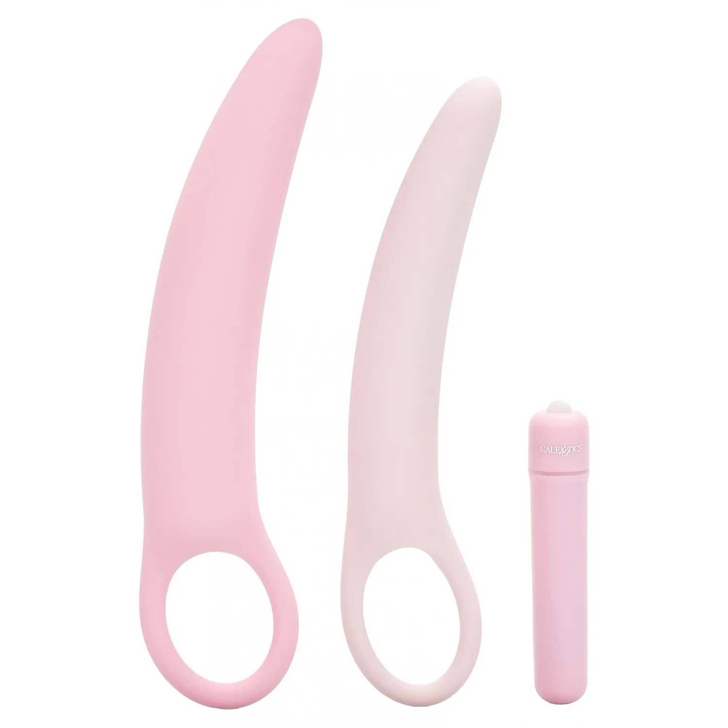 Set de 3 piese CalExotics cu două dilatatoare din silicon de lux și un stimulator vibrator subțire. Design ergonomic cu buclă pentru deget, rezistent la apă, funcție de vibrații și alimentare AAA. Excelent pentru recuperare și antrenament treptat.