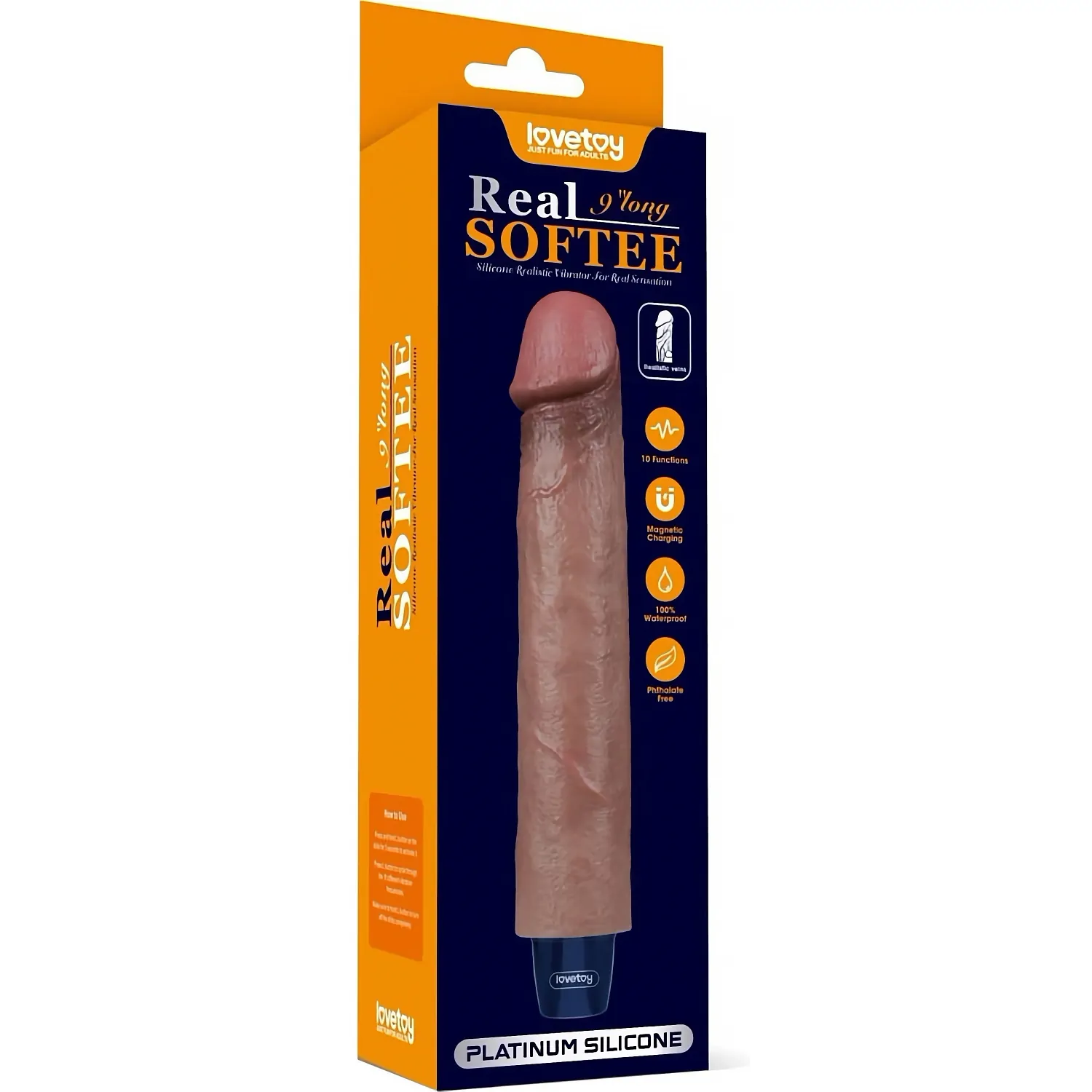 Vibrator Lovetoy Real Softee din silicon platină, moale la atingere, cu 10 moduri de vibraţii, motor insonor şi încărcare USB. 100% impermeabil, mărime 22.8 cm (inserabil 20 cm), diametru 4 cm. Estetică realist pentru stimulare precisă.