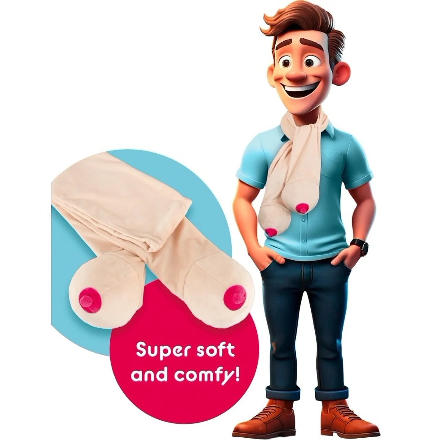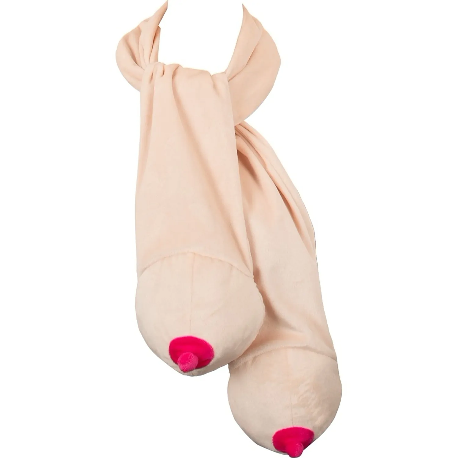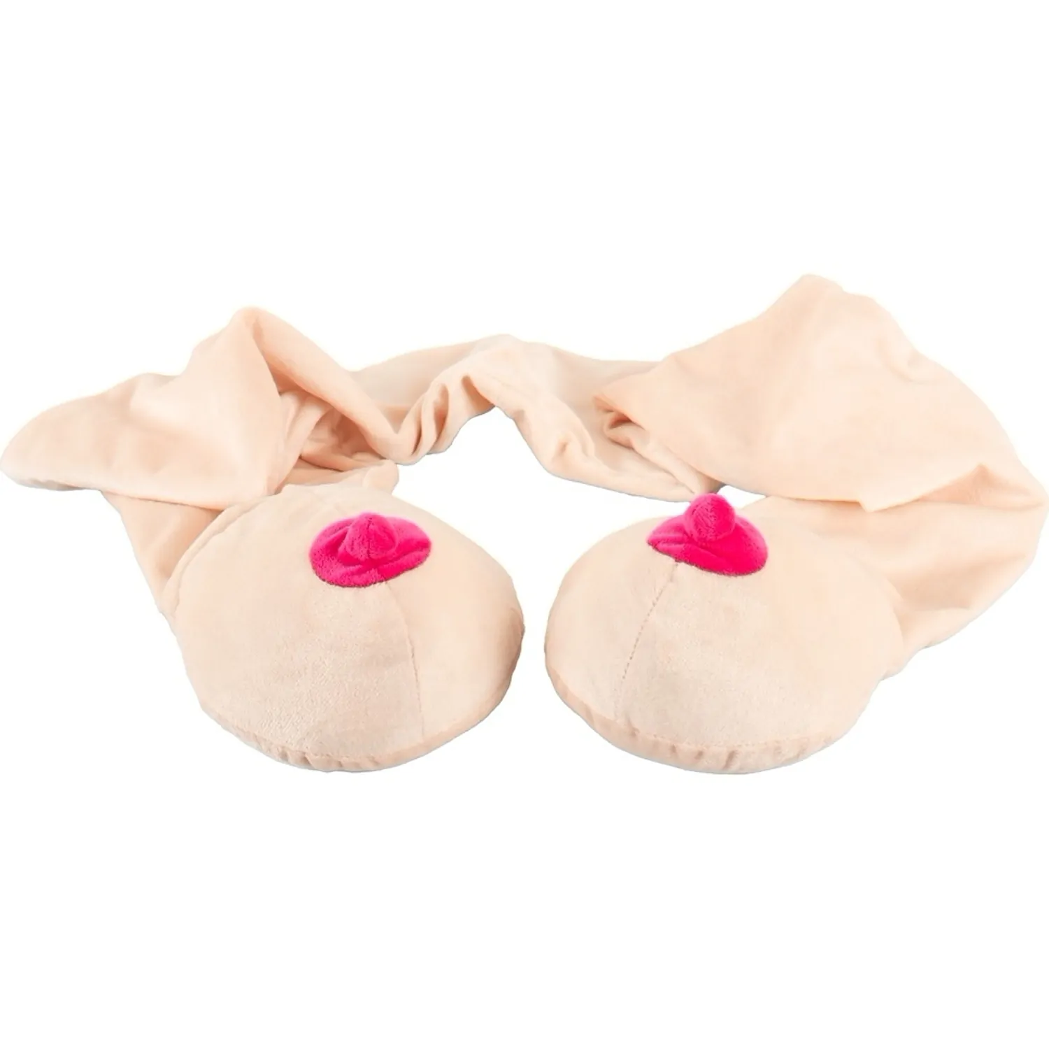 Un accesoriu jucăuș care atrage privirile la petreceri și carnavaluri. Eșarfa are la cele două capete câte o siluetă stilizată de sân, finisată cu o areolă roz. Tonul bej deschis și textura pufoasă o fac potrivită pentru ținute de petrecere sau momente amuzante cu prietenii.